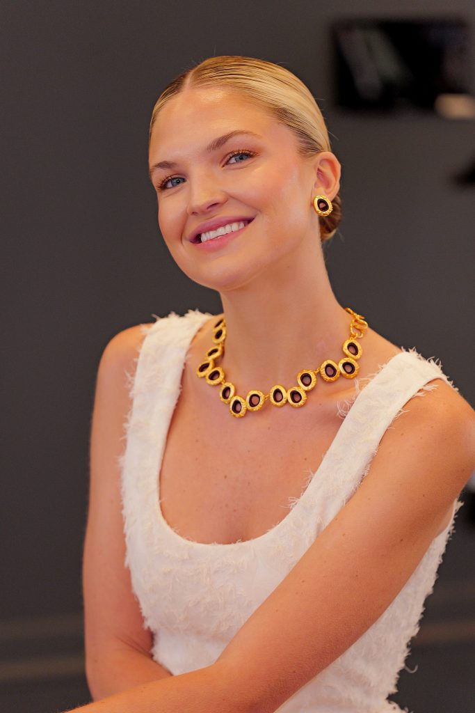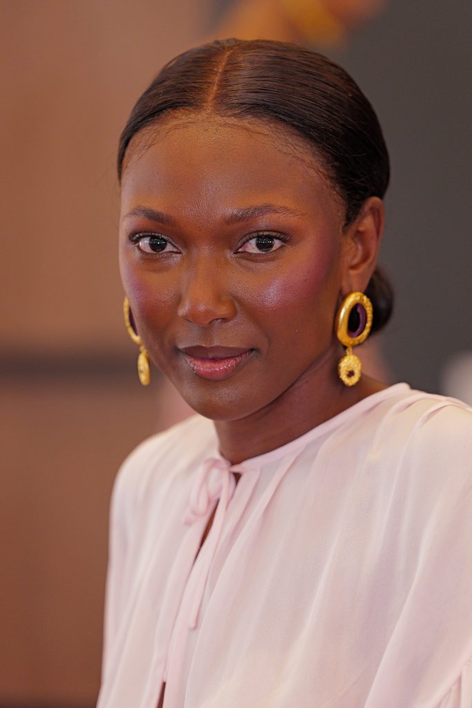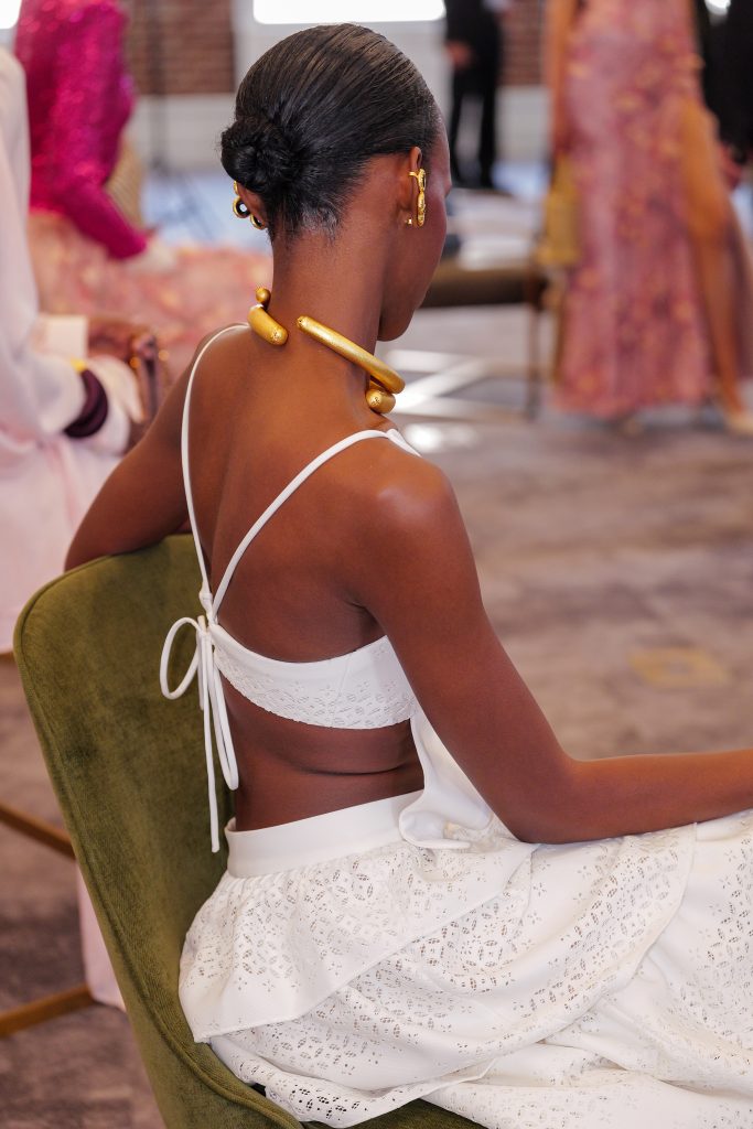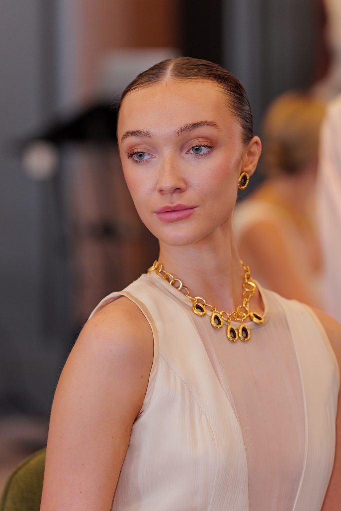 Beauty remained pared back, with clean hair and glowing skin framed by statement gold accents, ensuring that the garments’ details took center stage.