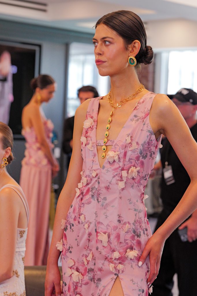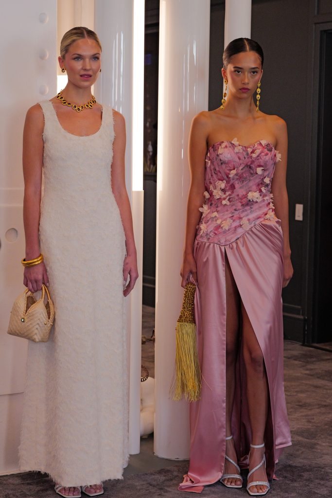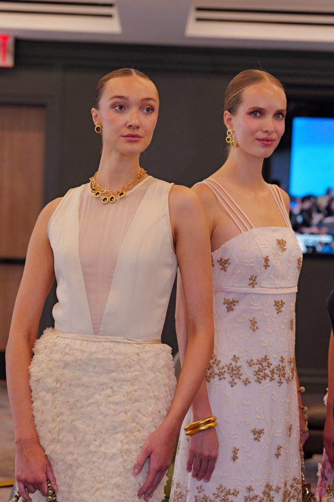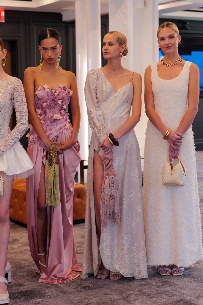 Staged at the Studio 45 on the 27th floor of Rockefeller Plaza, the presentation unfolded against sweeping Manhattan views – a fitting metaphor for a designer finally taking his place on the city’s most prestigious stage. Guests and press circled the room as models posed in gowns that spoke the language of renewal, growth, and feminine strength.