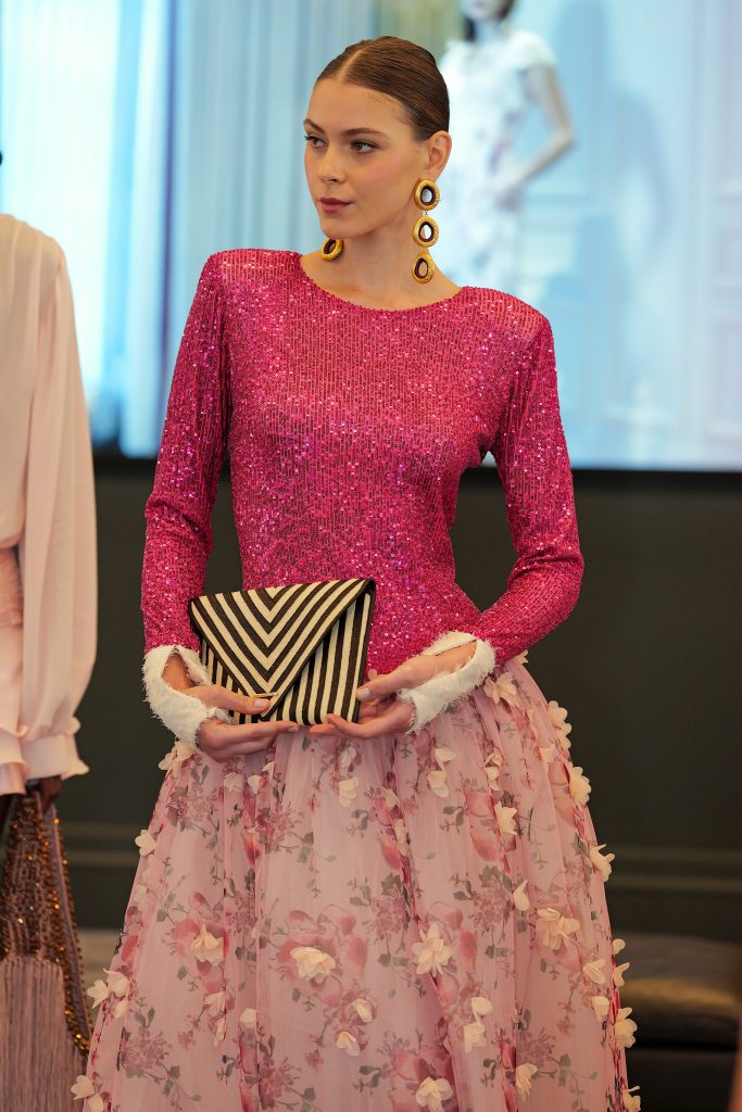 Silhouettes emphasized fluidity and form in equal measure. Cruelty Free Luxury and Bridgetown inspired floor-length gowns with tiered skirts and sculptural bodices were paired with sharp waist cutouts, creating a push-pull between delicacy and confidence. One highlight was a pink sequined top, inspired by Anna Wintour and styled with a voluminous floral skirt, delivering unapologetic drama.