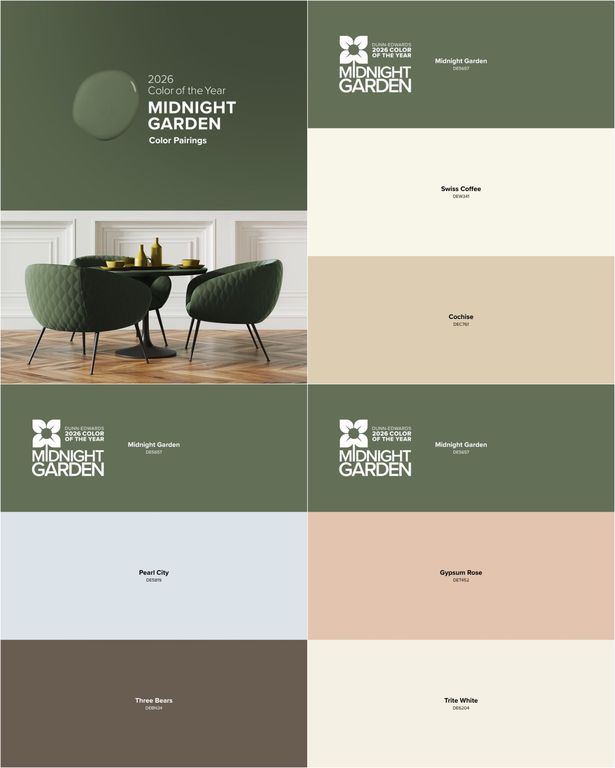 Tags: 2026, architectural walls, cabinetry, Color, color codes, Color of the Year, Color of the Year 2026, color palette, color swatches, color trends, COY 2026, COY26, decoration, design, DIY, Dunn-Edwards, earthy colors, exterior accents, fashion, Gypsum Rose, home decor, interior design, interior trends, interior walls, kitchen, Midnight Garden, Midnight Garden DE5657, muted green, paint, paint colors, painting, Swiss Coffee, Three Bears