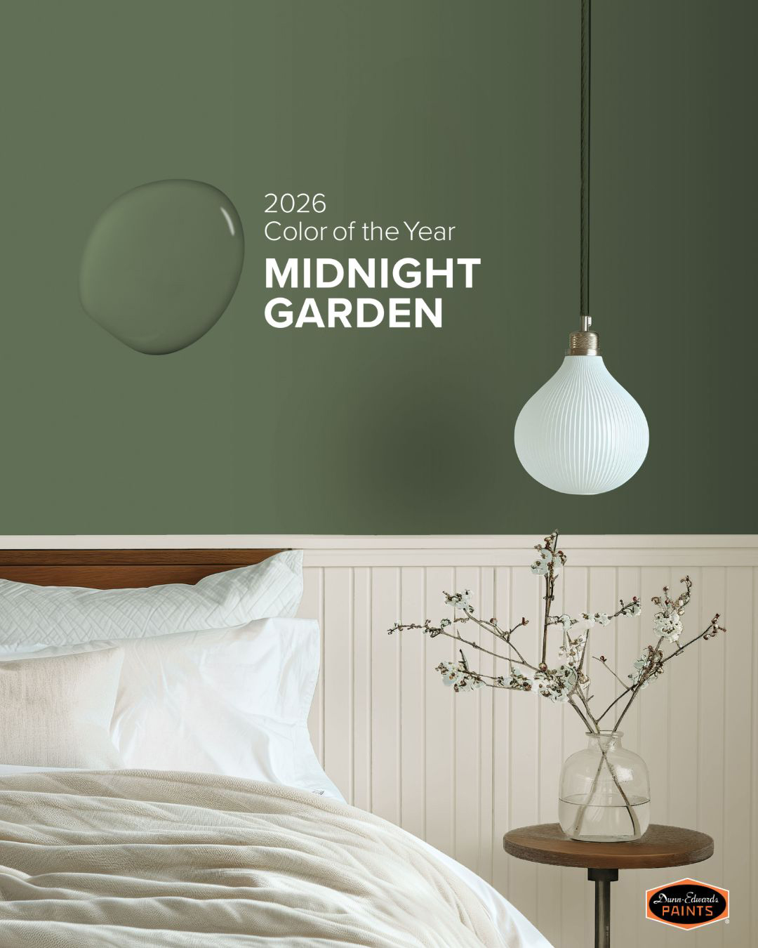 Introducing Dunn-Edwards 2026 Color of the Year, Midnight Garden (DE5657), a deep, muted green with earthy undertones that capture the quiet elegance of nature.