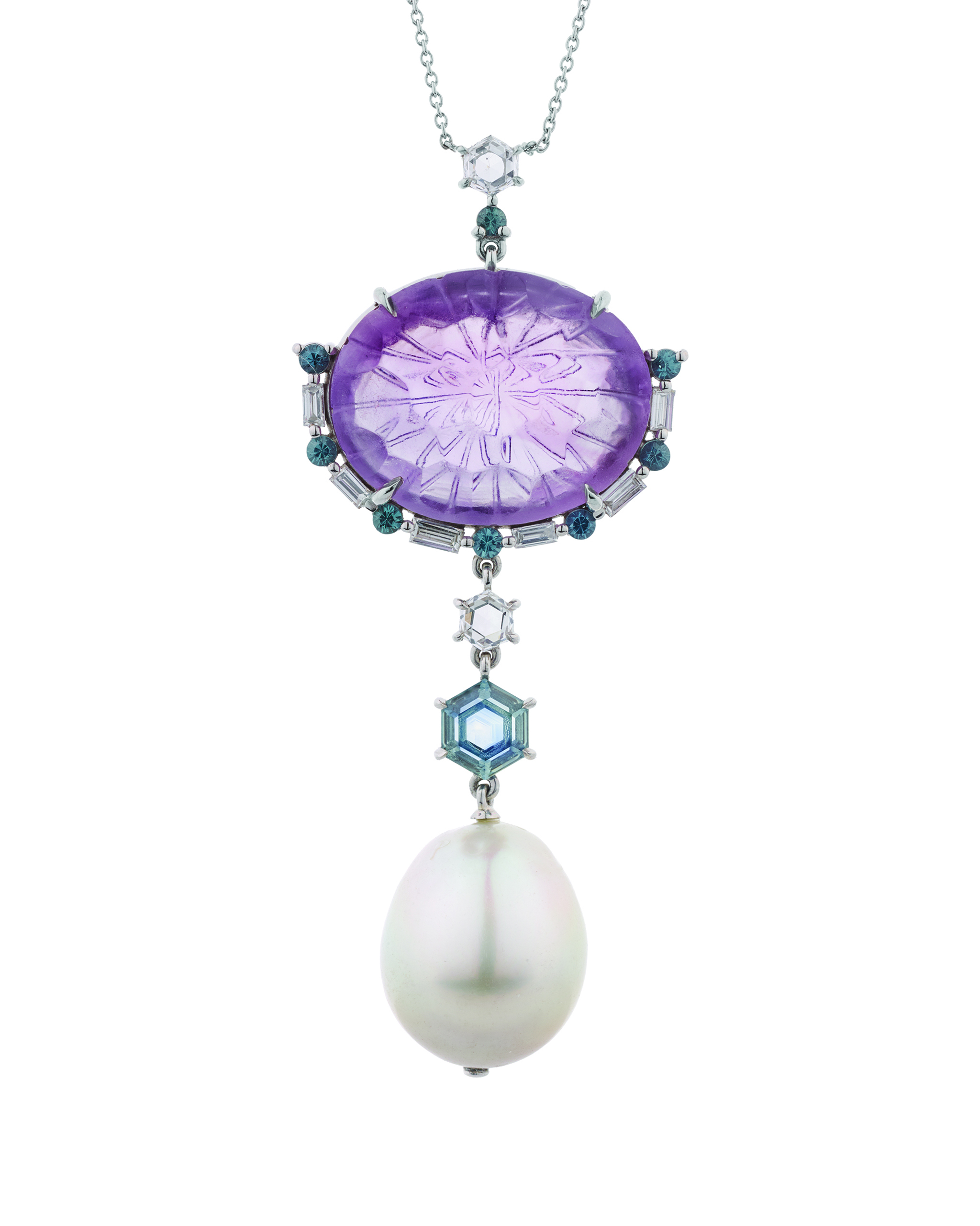 At the center of this singular creation lies a remarkable legacy-an early Sasanian amethyst, hand-carved with a radiating, starburst motif nearly 1,500 years ago (circa 4th-6th century AD). Weighing an impressive 23.37 carats, this ancient gemstone glows with the intrigue of Persian courts and Zoroastrian mysteries, its unique geometric pattern echoing the cosmic and solar motifs so beloved in late antique Iran. This extraordinary centerpiece is set in platinum and surrounded by contemporary geometric brilliance: a 1.11ct no-heat Montana sapphire and two hexagonal E/VVS diamonds (0.27ct total) create a striking symmetry, while flashes of teal color-change garnets (0.41ct total), antique baguette diamonds (0.33ct total), and a lustrous South Sea pearl add depth and luster. The bold shapes and platinum setting subtly reference the dynamic geometry and modern sensibility of Art Deco design, drawing a visual bridge from antiquity to the cutting edge of the 20th century. Suspended on a platinum chain, the Charm of the Hexagon is a wearable narrative-where ancient Persian mystery meets Deco-era elegance, inviting new stories at every turn. (Photo courtesy of Rebecca Rau Jewels)