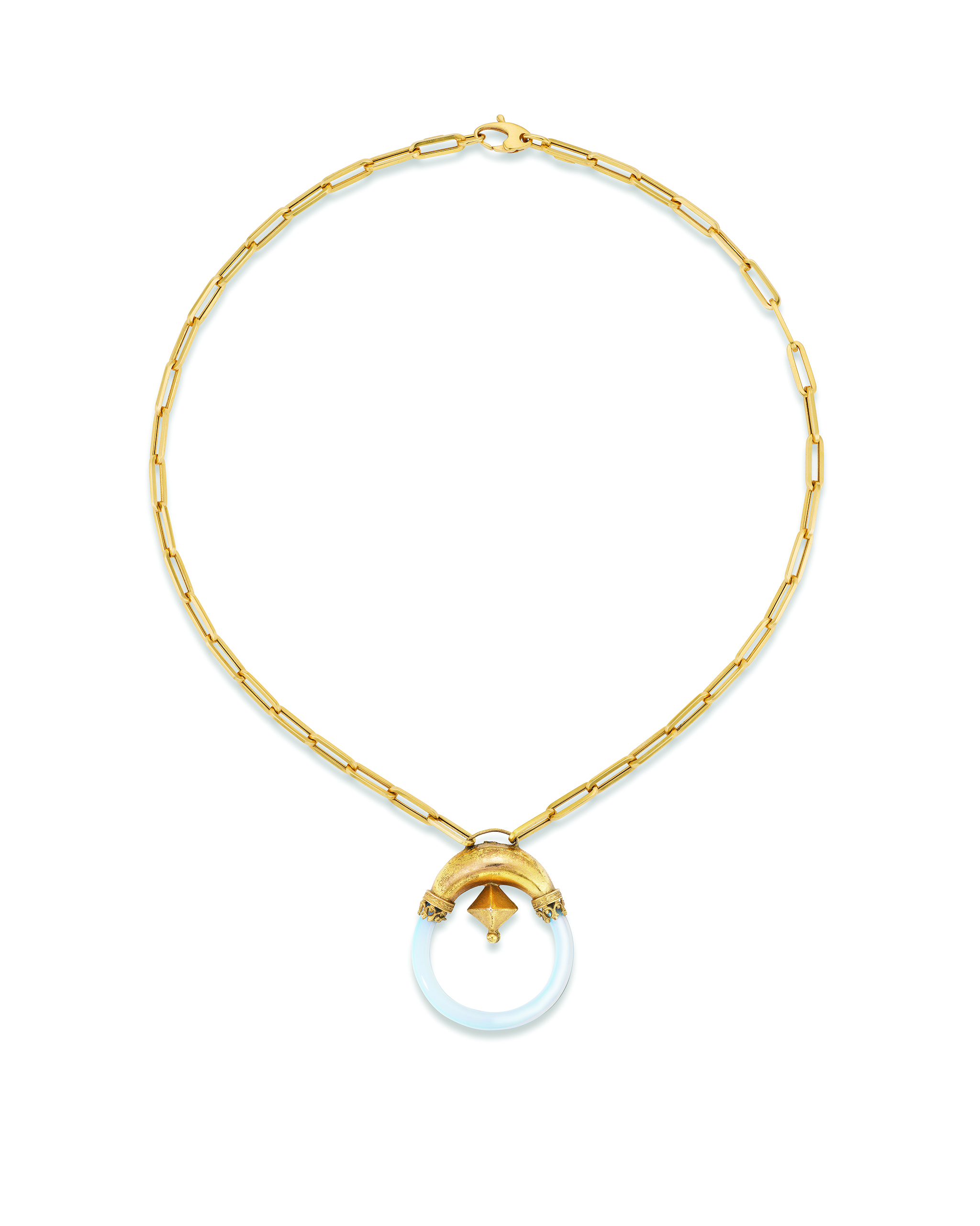 This rare Gothic-style Medieval pendant, dating from 14th-century Europe, exudes timeless elegance and intrigue. Crafted from early glass and high-karat gold, the pendant glows beautifully in both daylight and low light creating a mysteriously luminous presence. Surprisingly contemporary, it hangs effortlessly from a chic 18k “paperclip” gold chain, blending historical artistry with a nod to contemporary versatility and taste. (Photo courtesy of Rebecca Rau Jewels)