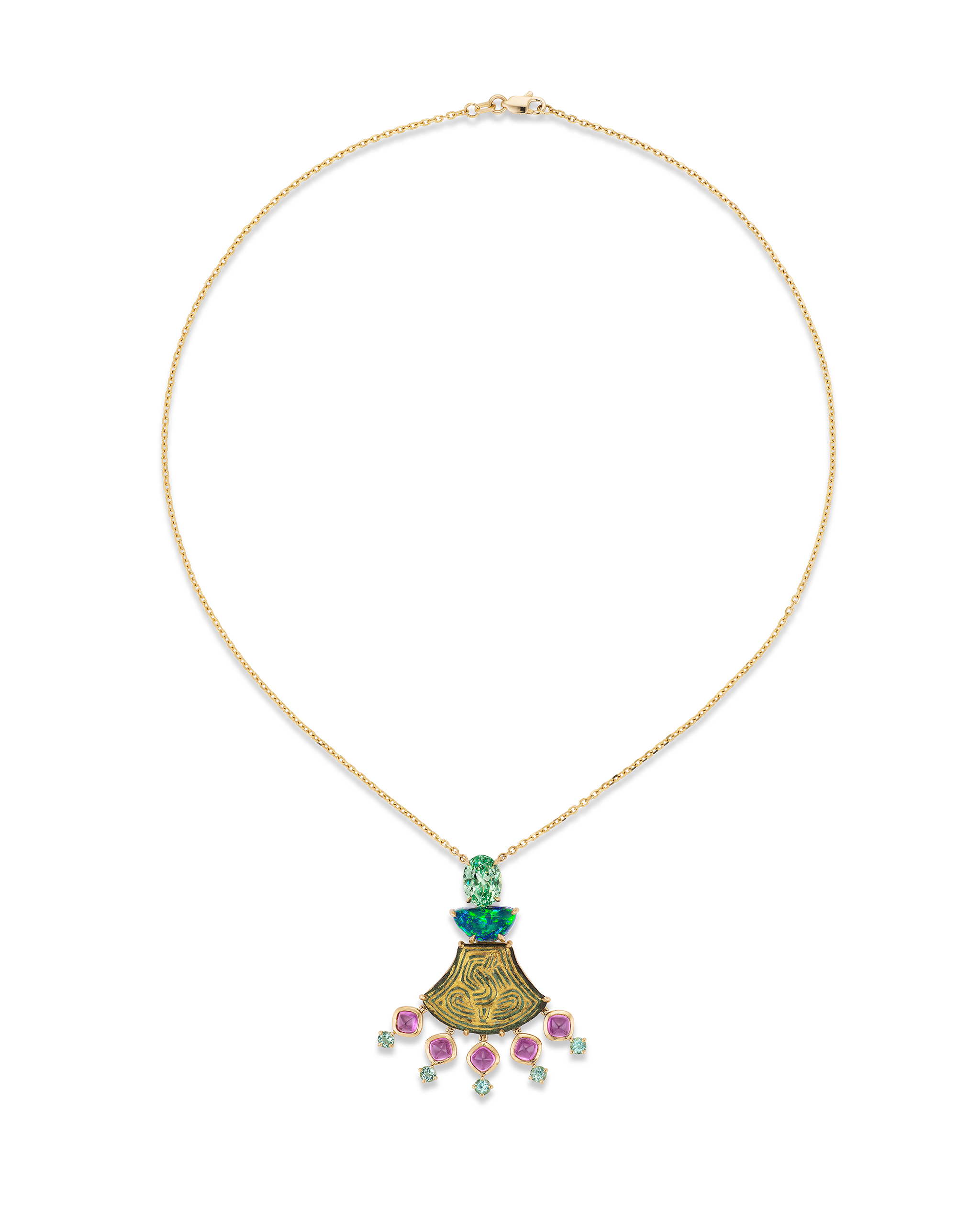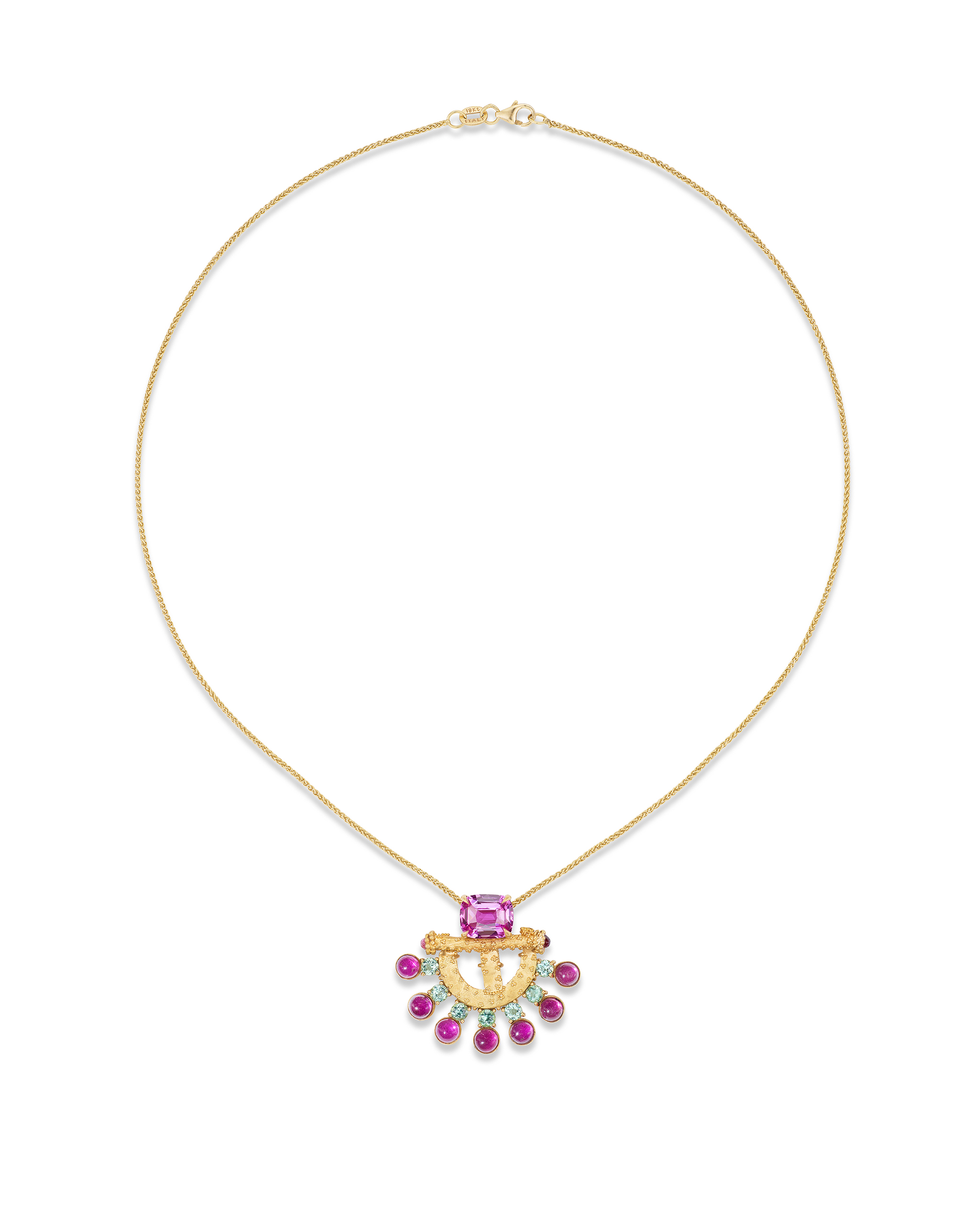 Unearthed from the currents of ancient ceremony, “The Granulated Goddess” pendant centers a Phoenician high-karat gold votive pendant that is axe-shaped and adorned with fine gold granulation. Crafted between 600–400 BC, this captivating fragment hails from the tradition of elaborate ceremonial necklaces on the ancient Mediterranean coast, where several such pendants—engraved with intricate geometric motifs and rich in goldsmith artistry—would drape a woman of privilege and influence. This pendant’s remarkable decorative technique finds echoes in treasures unearthed from Tomb 18 at the Les Casetes necropolis, Villajoyosa (Alicante), Spain, a testament to the Phoenicians’ vibrant trade and cultural legacy throughout the Iberian Peninsula. Part adornment, part symbol, it may once have been given as a wedding gift—conveying fortune, protection, and divine connection. Surrounding this ancient centerpiece, a selection of luminous gemstones brings modern allure: a no-heat pink sapphire (3.02ct), cabochon rubellite tourmalines (3.25 total carats), and teal round tourmalines (0.56 total carats), all set in 22k yellow gold. These combined elements celebrate the Phoenician legacy of cultural influence around the Mediterranean. (Photo courtesy of Rebecca Rau Jewels)