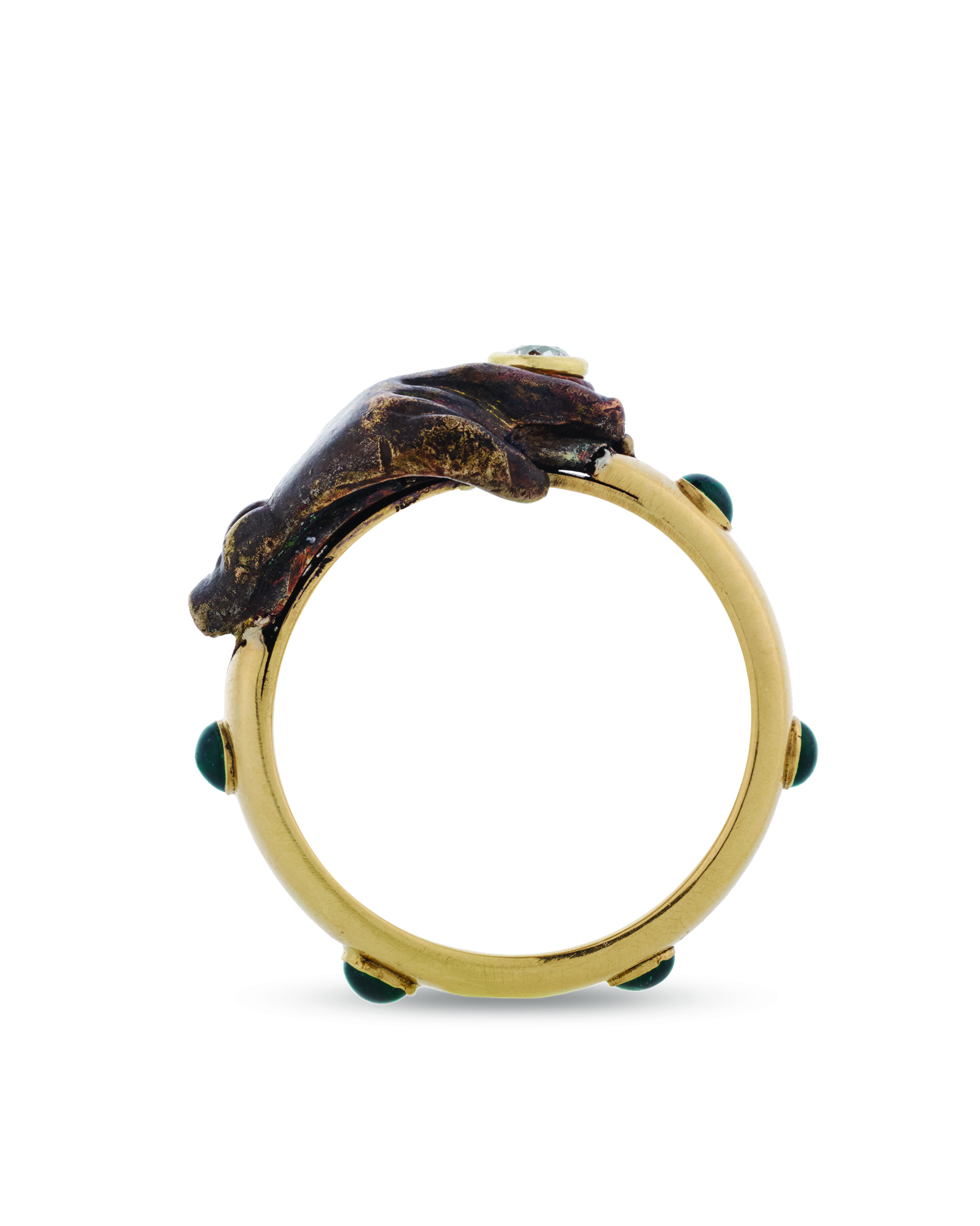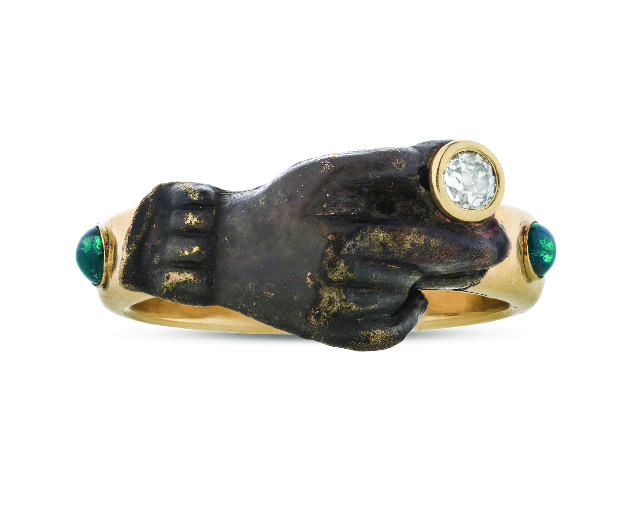 This captivating ring bridges centuries of devotion and artistry. Originally crafted between 1400–1600 AD in a coppery silver alloy, its hand-shaped “Fede” (fidelity or faith) motif symbolized loyalty, trust, and the unbreakable bonds of commitment. Rings like this sealed vows and love stories throughout medieval Europe, cherished as tokens of both affection and solemn promise. Single-hand Fede rings are exceptionally scarce—most medieval examples feature clasped pairs—making this piece a truly uncommon survivor of its kind. The striking hand design has been thoughtfully reimagined for today. The historic cupped hand now cradles a 0.11ct bezel-set old mine diamond, while the ring shank features 0.52 total carats of vibrant green garnet cabochons, set in warm 18k yellow gold. Part of the original medieval shank is ingeniously embedded into the new gold band—honoring centuries of history with an ingenious comfortable fit. A true conversation piece, the Hand-in-Hand Ring melds ancient symbolism, radiant gemstones, and modern design into a wearable relic—inviting you to carry love’s legacy, hand in hand, wherever you go. (Photo courtesy of Rebecca Rau Jewels)
