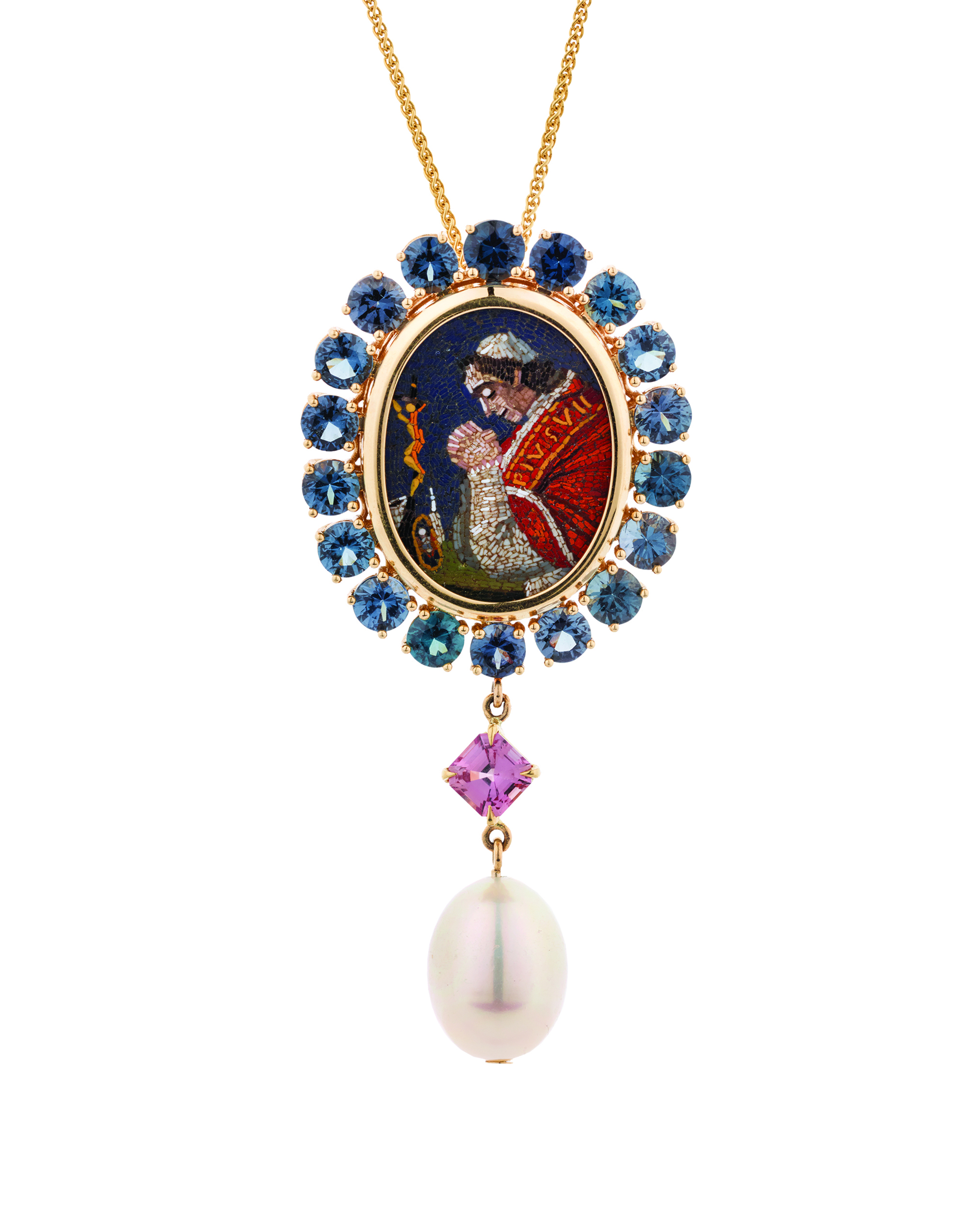 A tribute to endurance, faith, and artistic mastery, The Good Pope Pendant centers a magnificent 19th-century Italian micromosaic: Pope Pius VII in prayer, his figure rendered in thousands of minuscule glass tesserae by master Roman artisans. Such micro-mosaics, beloved as 18th & 19th century Grand Tour souvenirs, captured the romance and sacred artistry of Italy’s historic sites, painstakingly set into precious gold mounts for discerning travelers. Pope Pius VII (1742-1823), depicted here in devotion at a crucifix, was celebrated for his unwavering spiritual strength and benevolence amid the trials of Napoleonic Europe. Kidnapped and imprisoned by Napoleon, he became a symbol of resilience, compassion, and religious freedom for the Catholic Church-restoring peace and prestige after years of upheaval in France. Framing this prayerful portrait are over 4.5 carats of round grey-blue spinels that lend sparkle to the quiet dignity and wisdom of the pontiff. A vibrant 0.75ct orangey-pink asscher-cut sapphire and a luminous drop South Sea pearl offer additional movement and flair. (Photo courtesy of Rebecca Rau Jewels)
