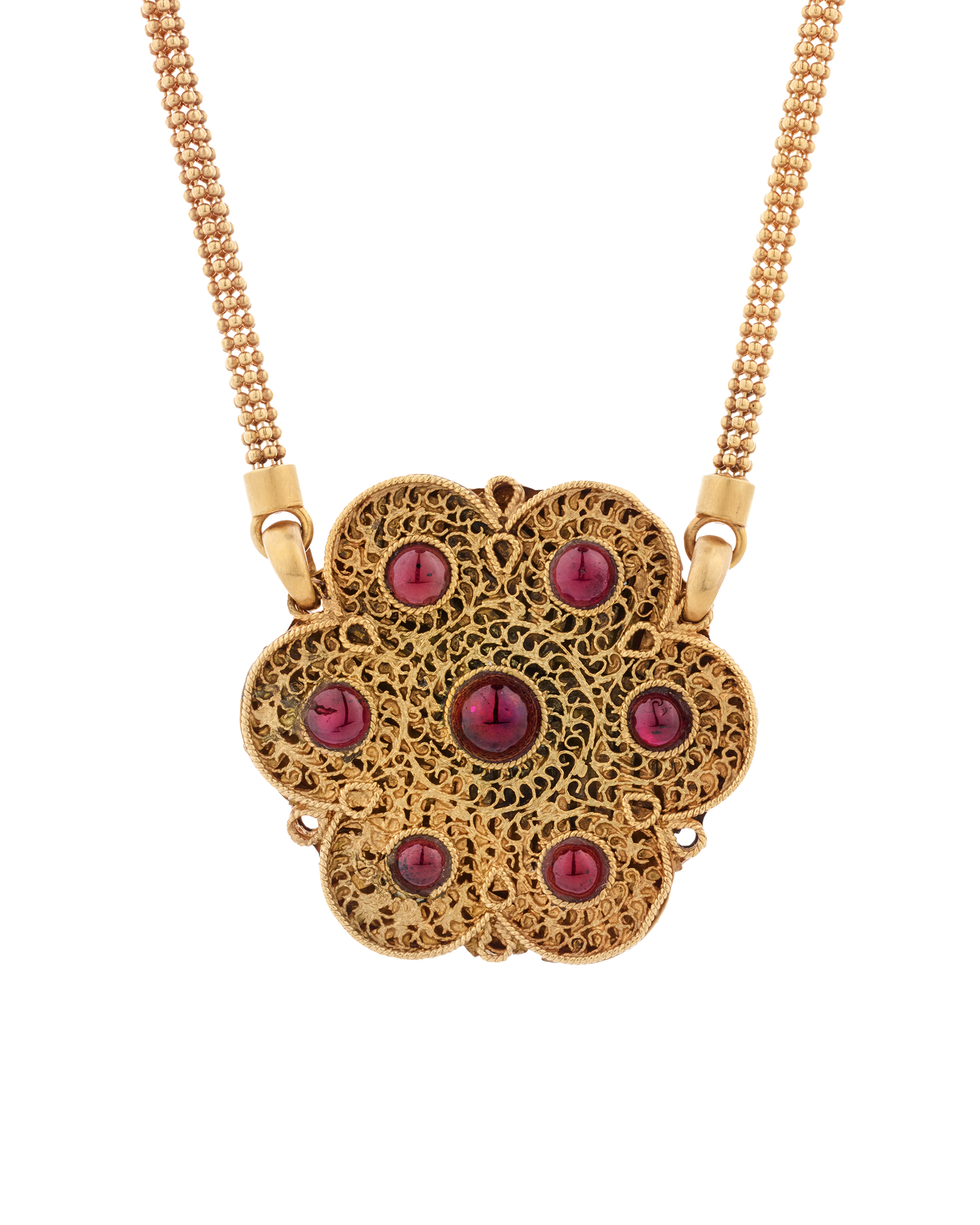 This Byzantine high-karat filigree pendant, dating from circa 700-900 AD, showcases deep garnet cabochons set within expertly crafted goldwork. Originally, such pendants may have been components of necklaces, earrings, or fibulae (brooches to fasten garments), with perimeter loops designed to attach additional gems. Garnet’s popularity in Late Antiquity placed it alongside sapphire, emerald, and amethyst as one of the most prized gemstones of the era. The hollow box construction, with a chased obverse soldered to a plain gold reverse, reflects early Byzantine techniques. Comparable filigree examples in cross form can be seen in The Met’s collection. The pendant is suspended from a contemporary 18k yellow gold chain, blending historical craftsmanship with modern wearability. (Photo courtesy of Rebecca Rau Jewels)