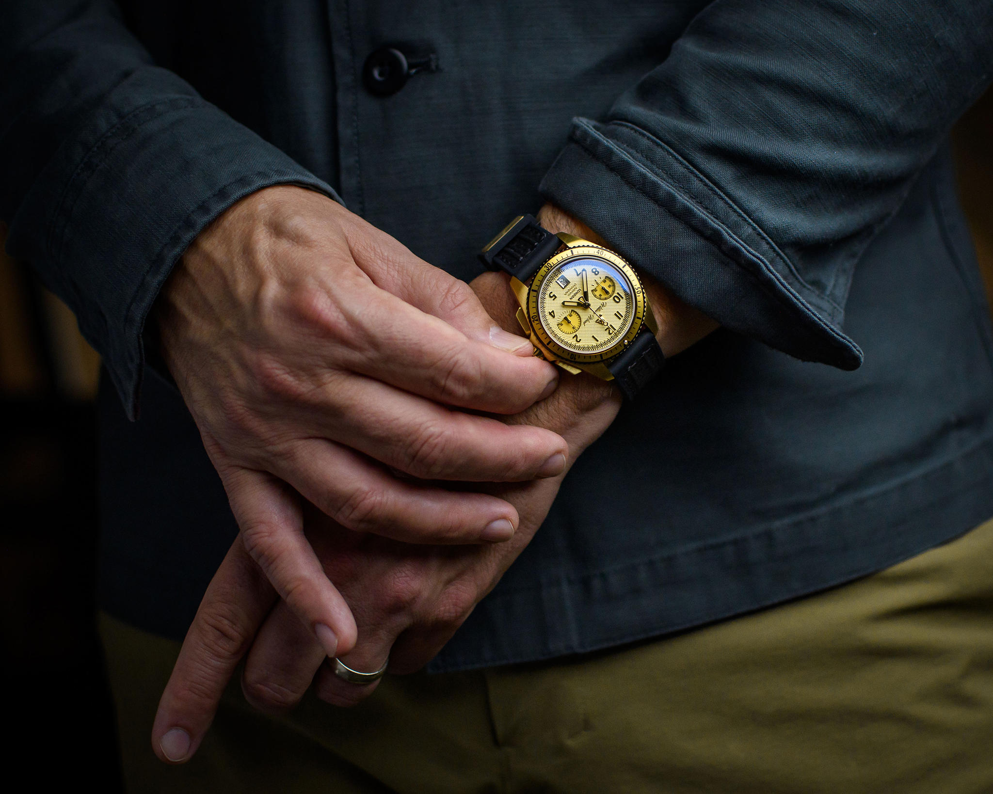 Dial Execution: The dial features a vintage champagne gold diamond-cut finish with cut-out indices and sub-dials positioned at 3pm and 9pm. The 3pm sub-dial measures the start/stop chronograph function operated by brass pushers, while the 9pm sub-dial displays the running seconds. A date window is positioned at 6pm and operated via the crown. The curved dial and hands create a subtle optical illusion when viewed from the side. Beneath the dial sits a vintage Super-LumiNova disc matched to the dial tone. The indices and hands are polished in gold to complement the vintage aesthetic.