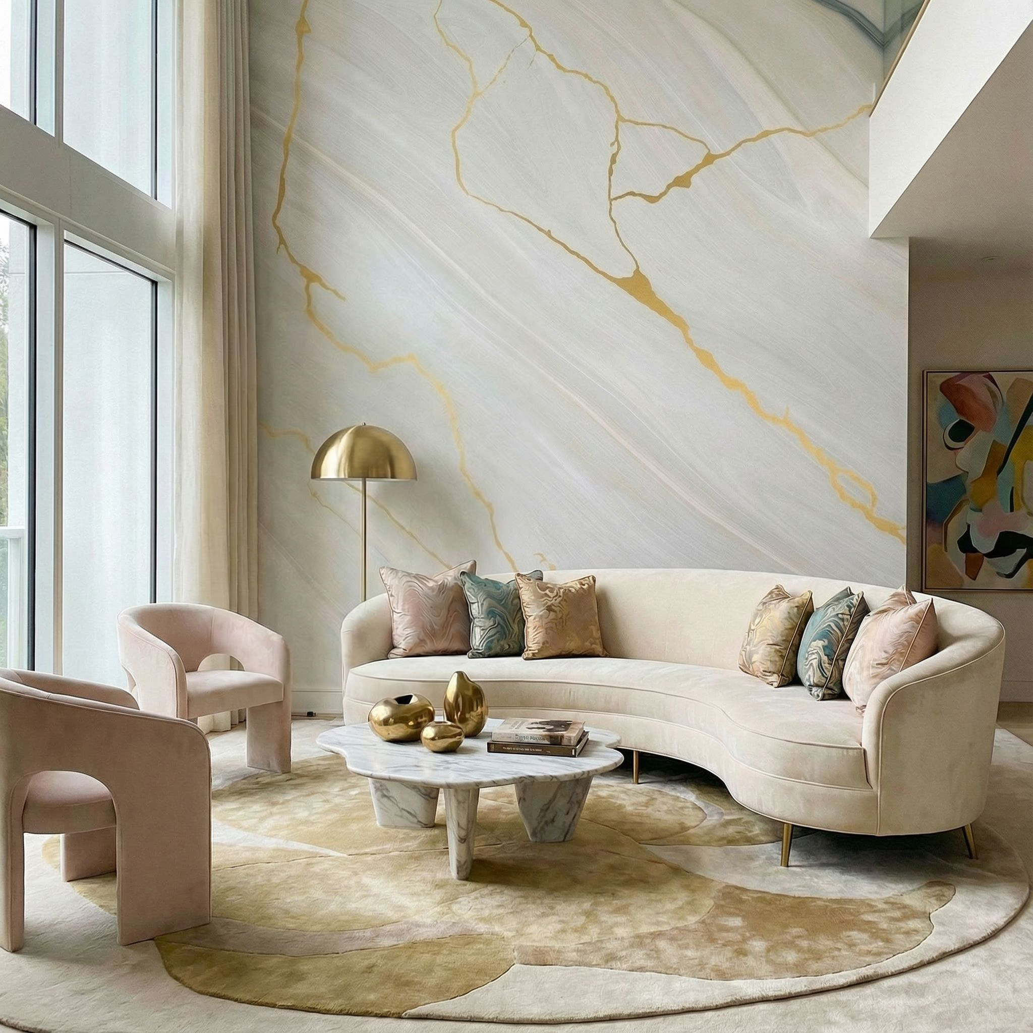 Sculptural curves, mineral textures and sunlit neutrals create an elevated yet understated sense of luxury. Surfaces feel tactile, warm and timeless. The design ethos is subtle enough to remain refined while adding visual depth. Wallpaper expressions of this trend draw inspiration from mineral-wash murals, soft marbling, plaster textures and clay-like surfaces that add quiet depth without overwhelming the room.