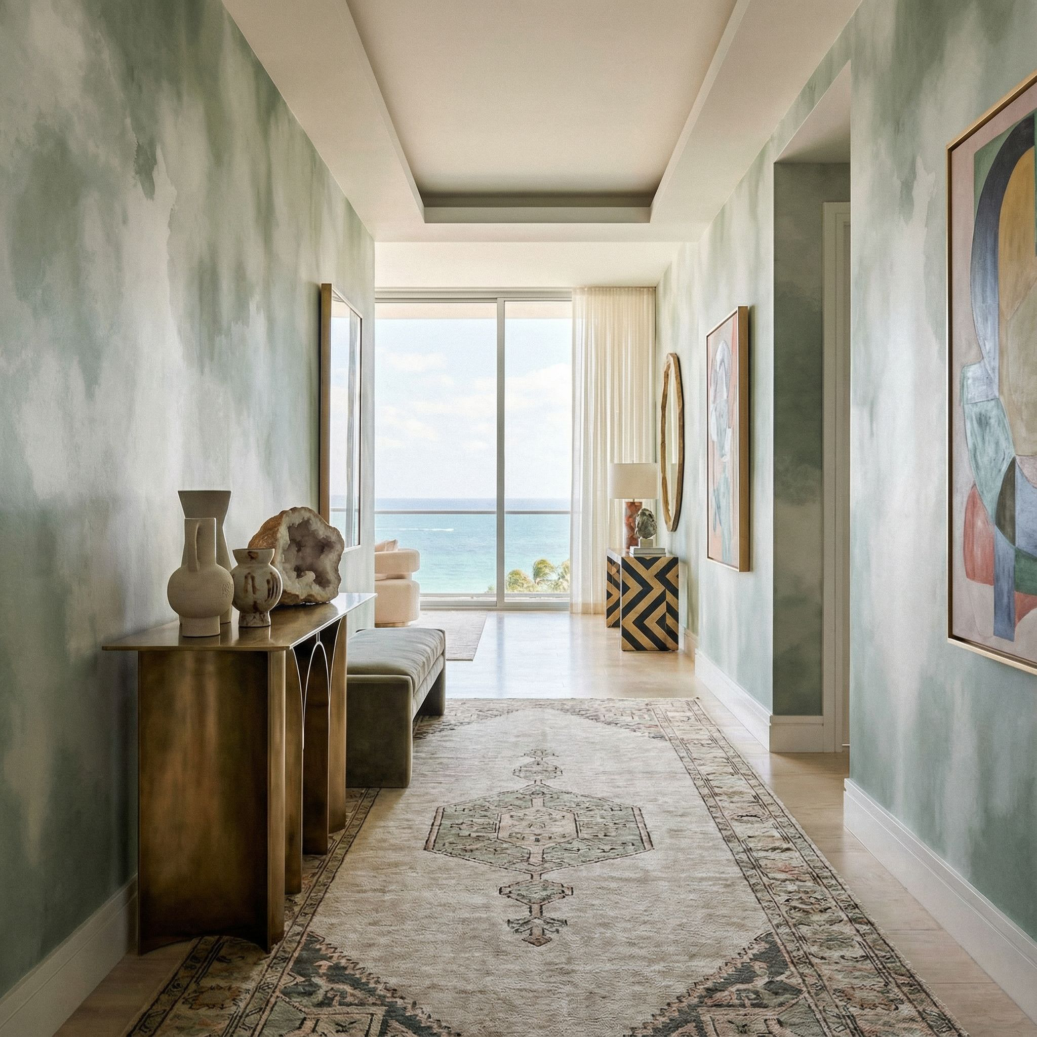 Wellbeing has become a design priority. Mist greens, mineral blues and soft clays create restorative spaces with gentle visual movement. Soft textures and nature-based patterns are central to the look. In wallpaper, this translates soft watercolor botanicals, gentle gradient washes and calm organic abstractions that reduce visual noise without losing character.