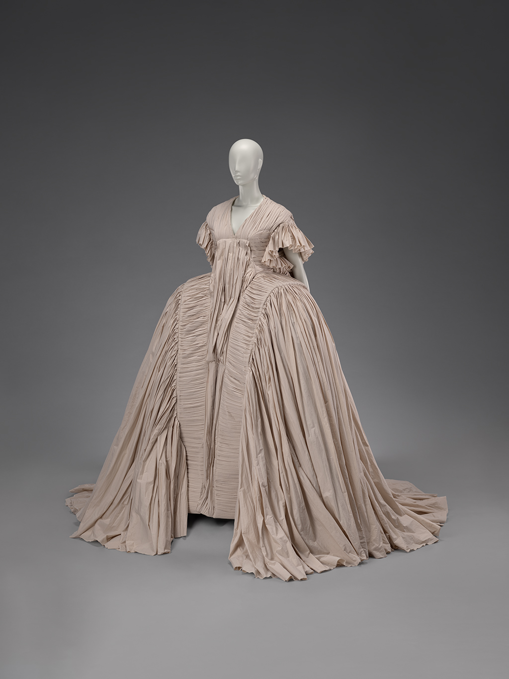These historic pieces will be displayed alongside recent acquisitions including a John Galliano dress from his Spring/Summer 1993 Olivia and Filibuster collection; an Alexander McQueen dress from the legendary designer’s final Plato Atlantis collection; and a lace ensemble by Karl Lagerfeld for Chloé worn by supermodel Kate Moss on the Fall/Winter 1993-94 runway.