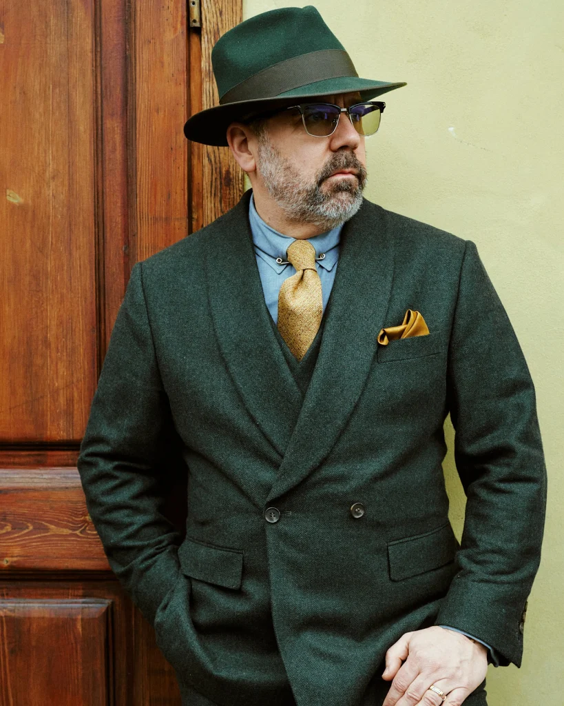 A sophisticated combination with distinctive character. The forest green double-breasted suit adds presence and visual depth, while the light blue shirt introduces freshness and balanced contrast. An elegant look, confident and with its own personality. (Image credits Brian Klimek @suittielinksbracesman Styled by Hockerty, Photos courtesy of Hockerty @hockerty_official)