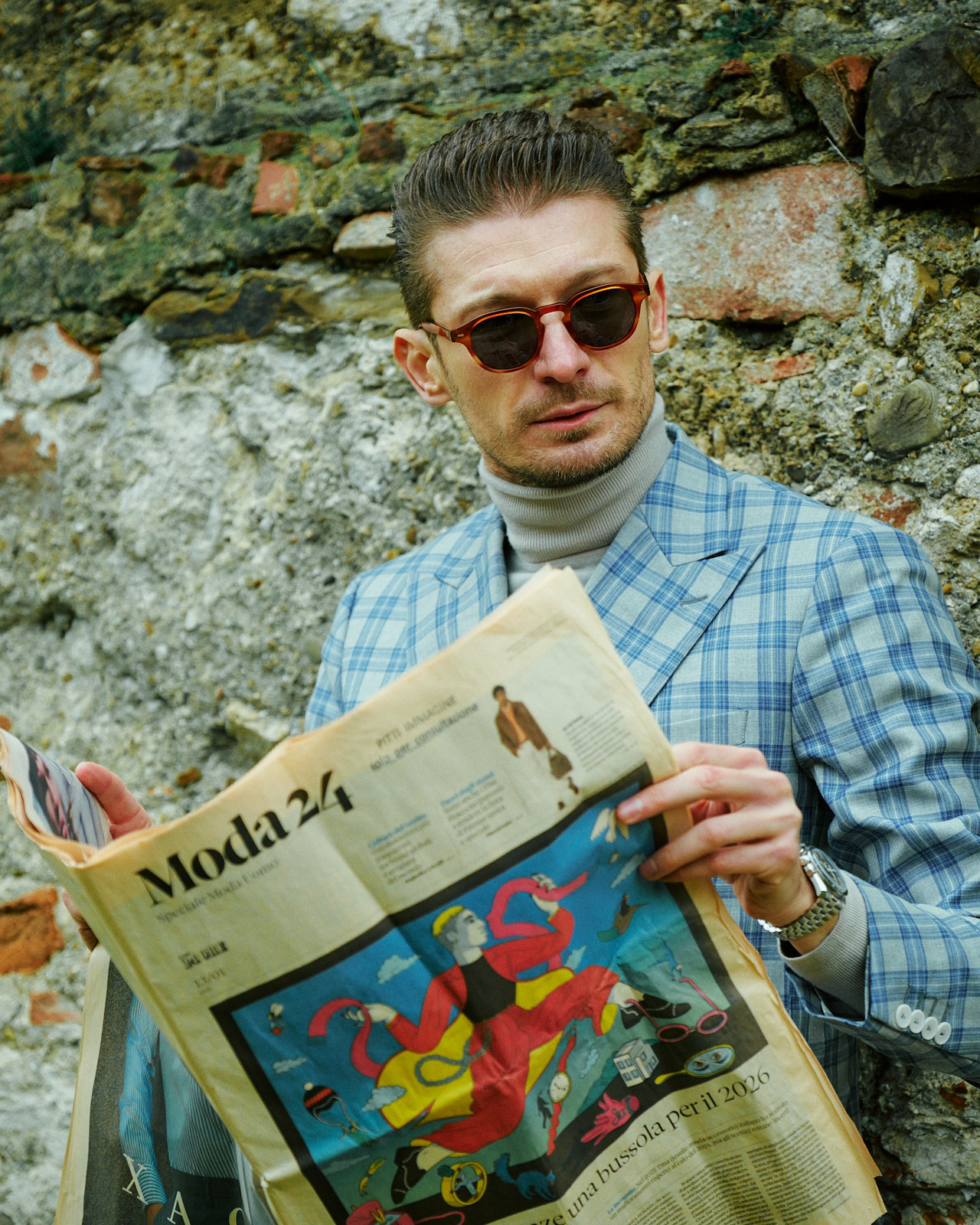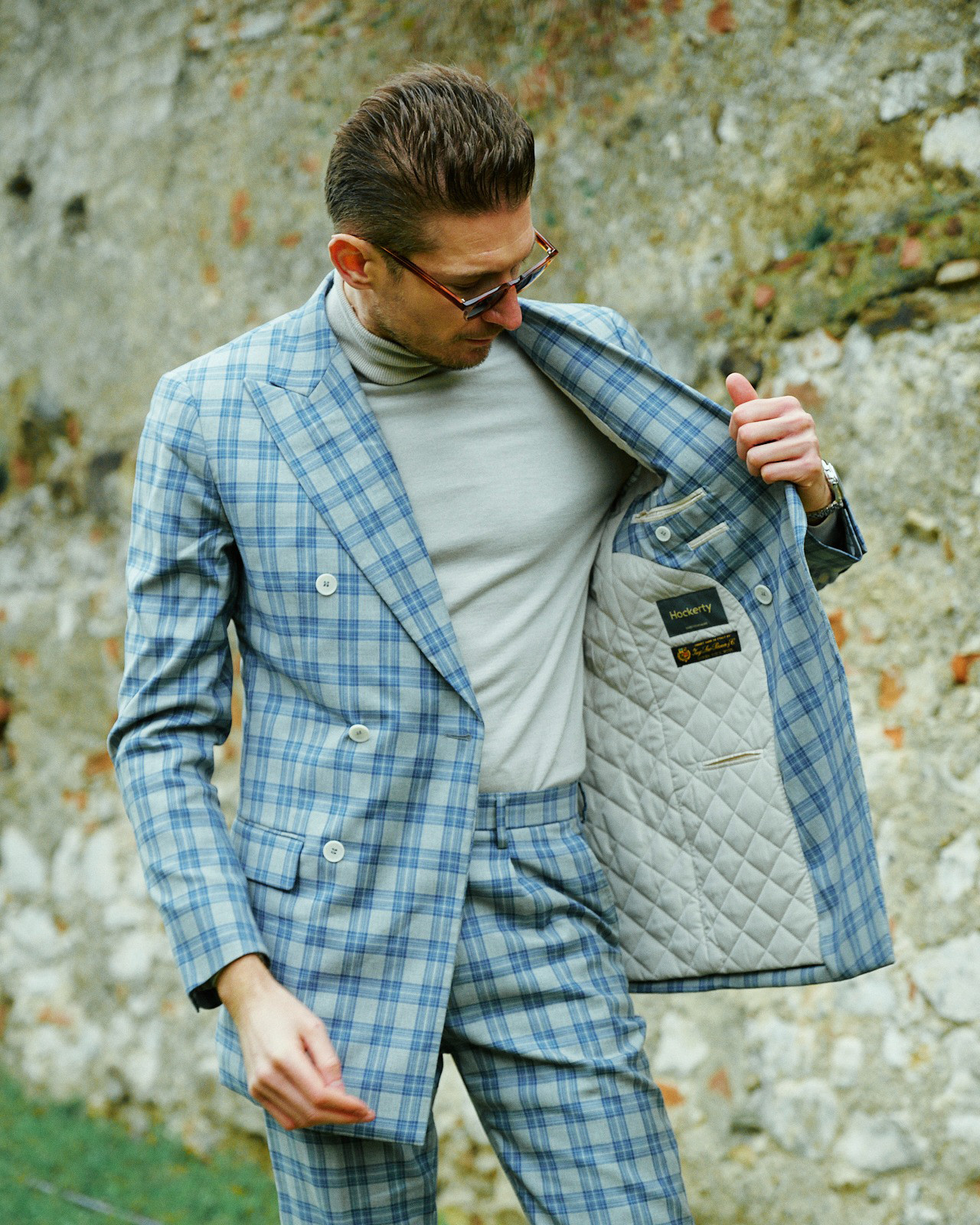 A sophisticated proposal with a contemporary air. The light blue checked double-breasted suit adds visual dynamism and structure, while the light grey high collar softens the ensemble with modern elegance. A balanced, distinctive, and refined look. (Image credits Gianluca Ala @gianluca_ala Styled by Hockerty, Photography by Alessandro Michelazzi @alessandromichelazzi)