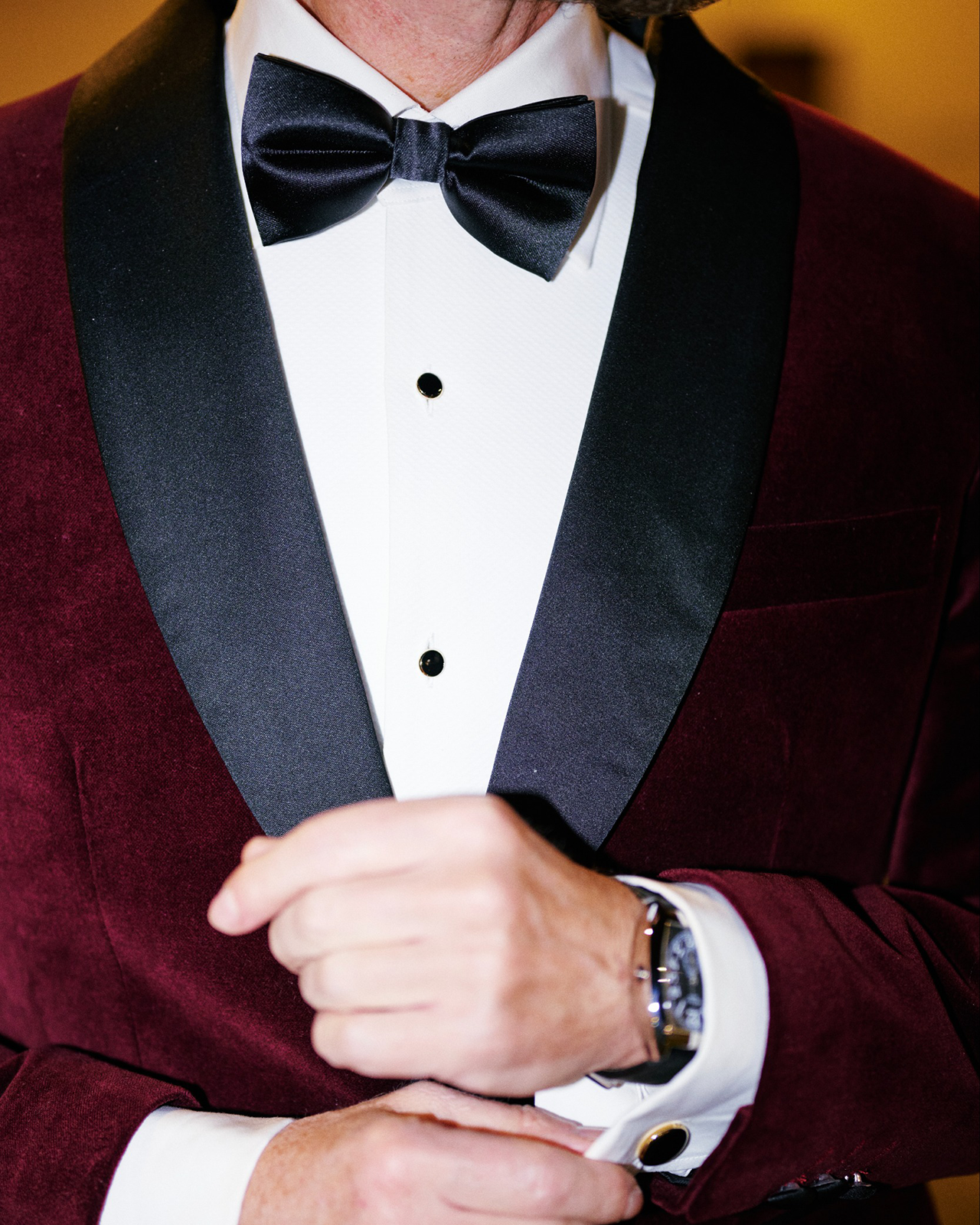 Burgundy Velvet Tuxedo Jacket with Black Tailored Trousers