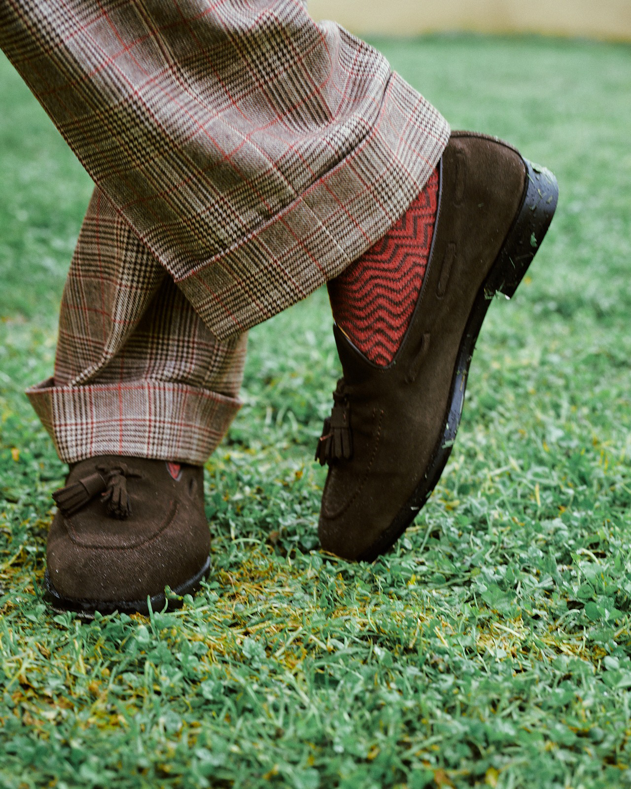Brown Checked Three-Piece Suit with Brown Tie / White Cotton Poplin Shirt with Double Cuffs and Contrast Collar / Brown Suede Loafers with Tassels