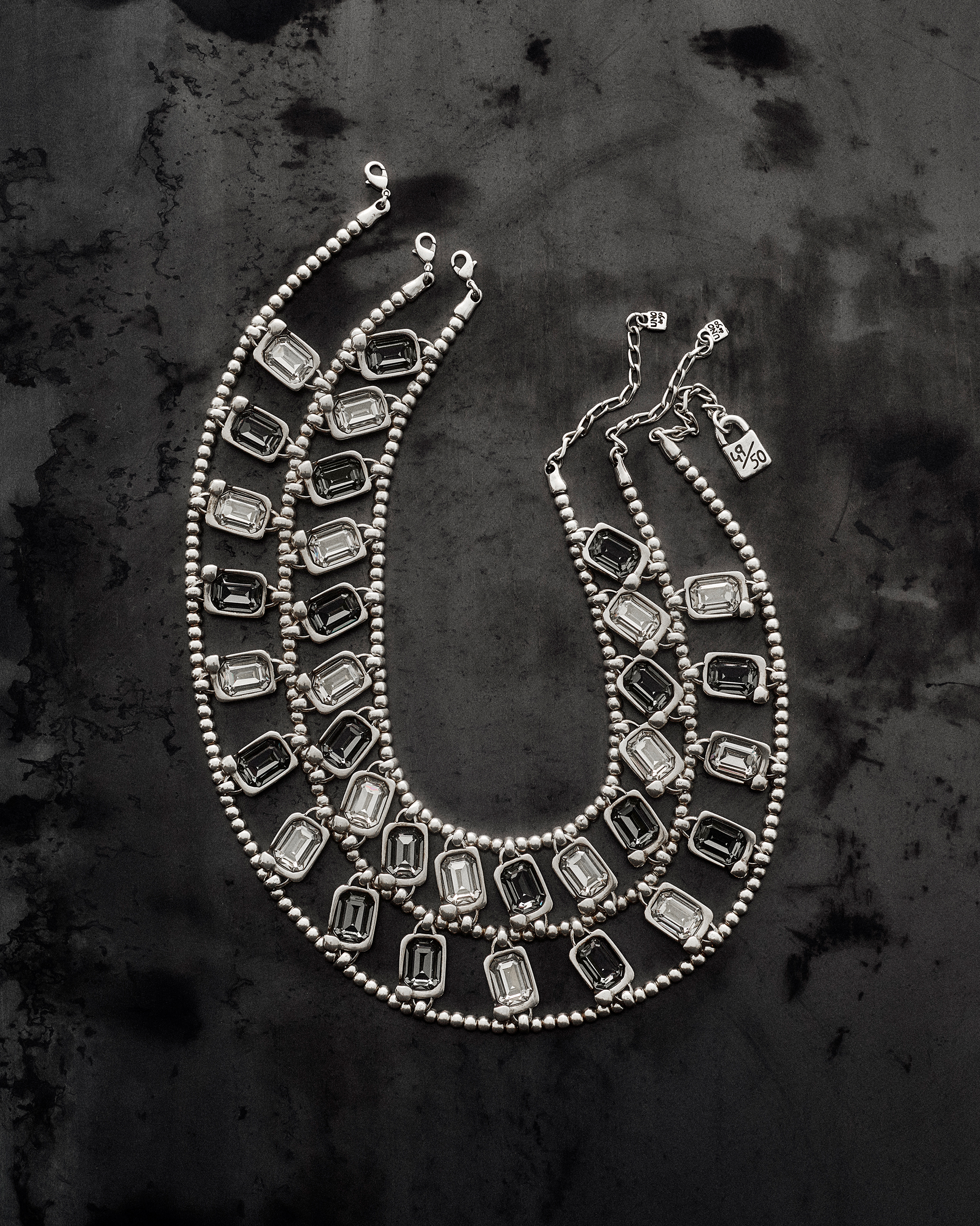Inspired by a fusion of art, nature, architecture, and cultures from around the world, the pieces are crafted mainly from metal alloys plated in 18K gold or silver, combined with crystals. The designs also incorporate carefully selected details such as leather, metal beads, pearls, or cotton cord.