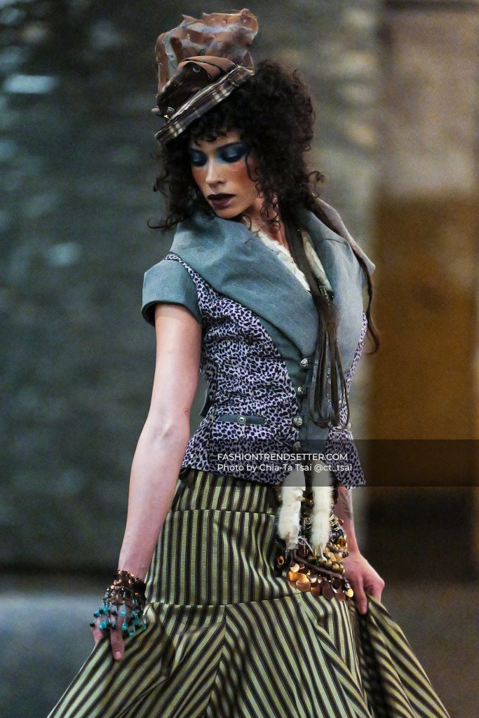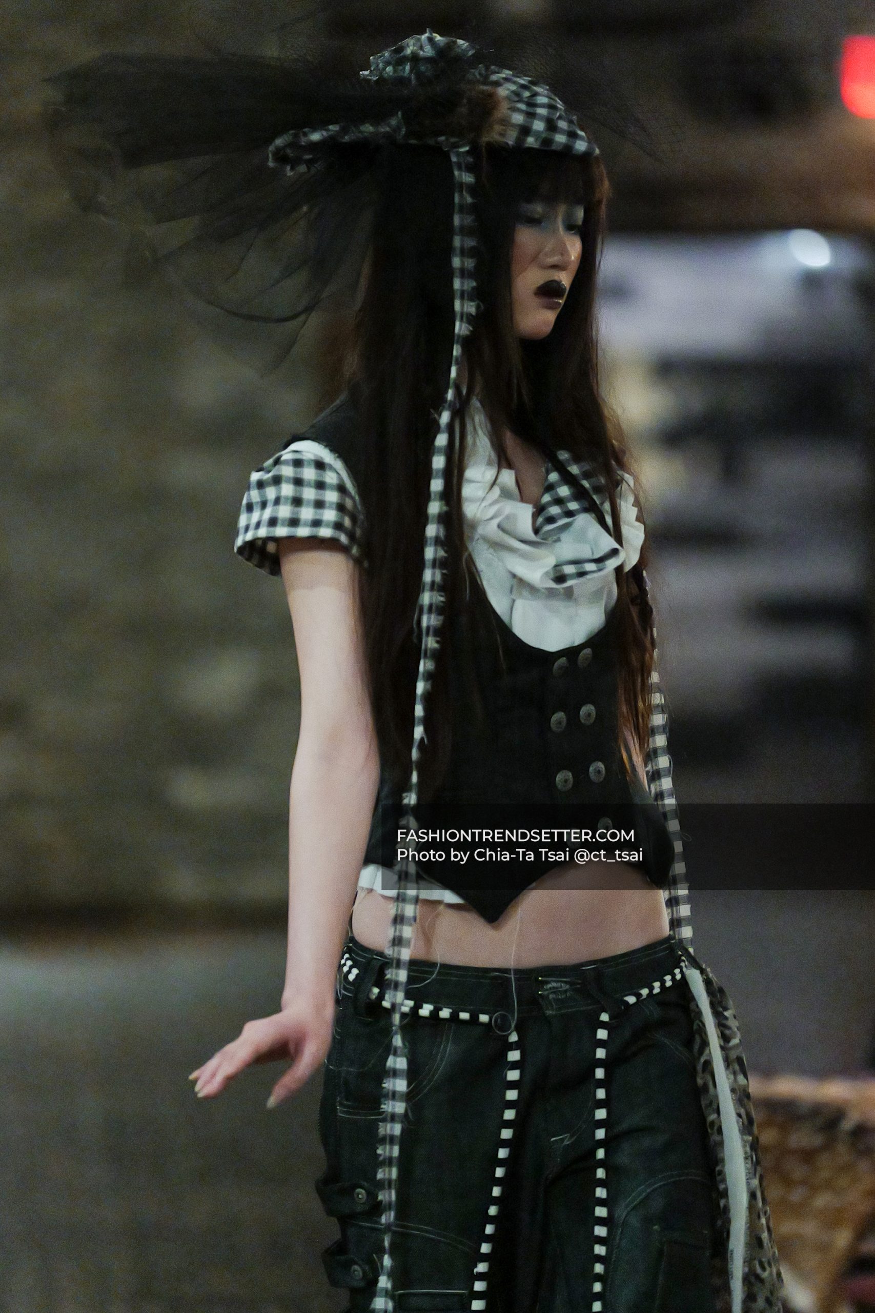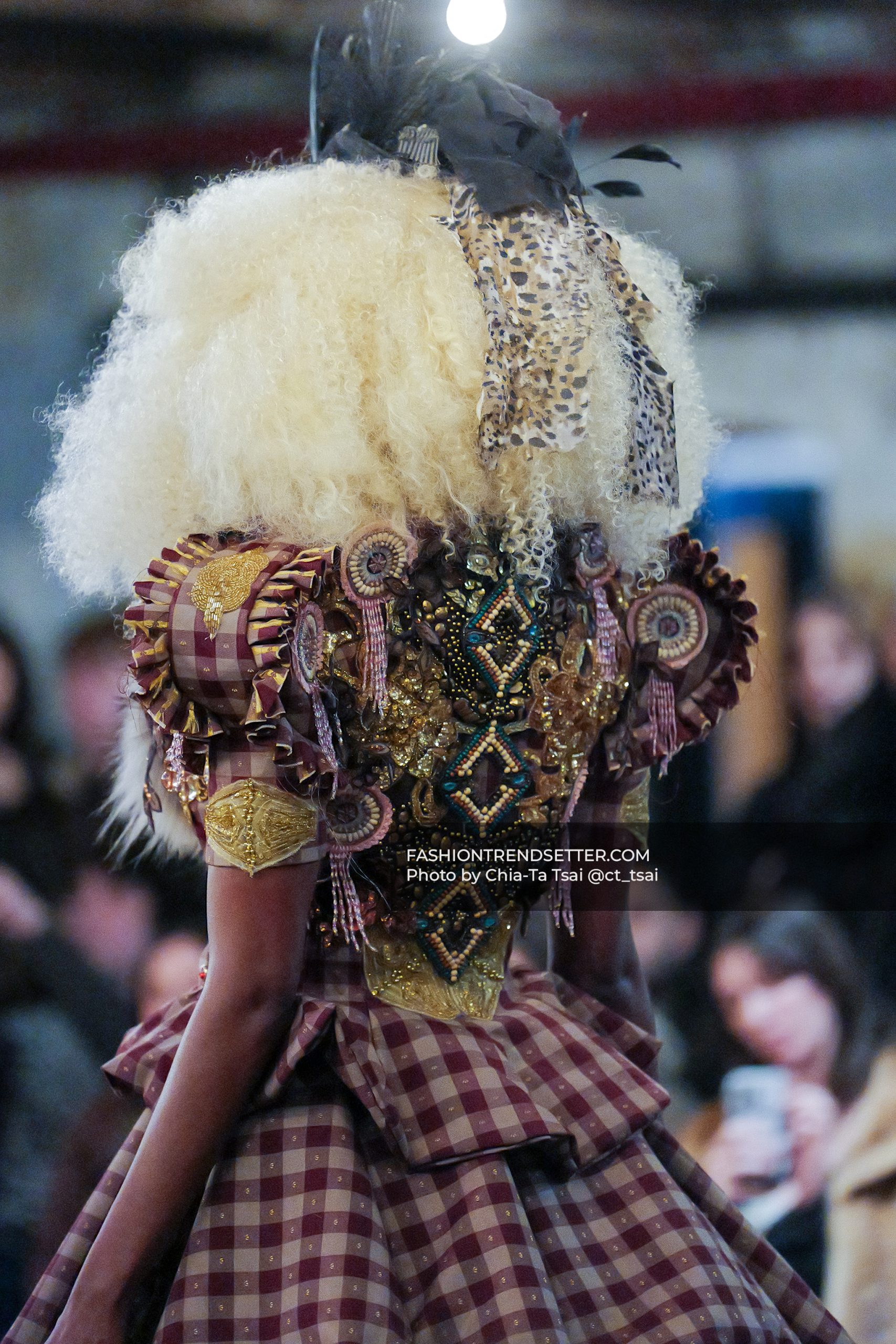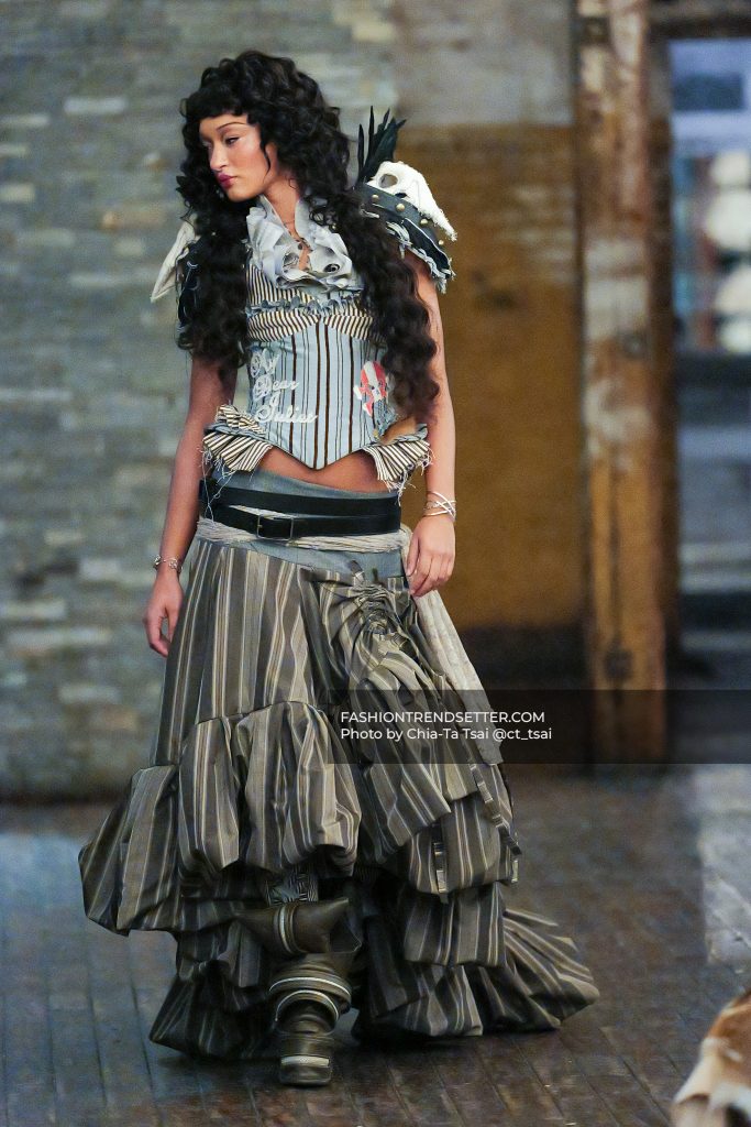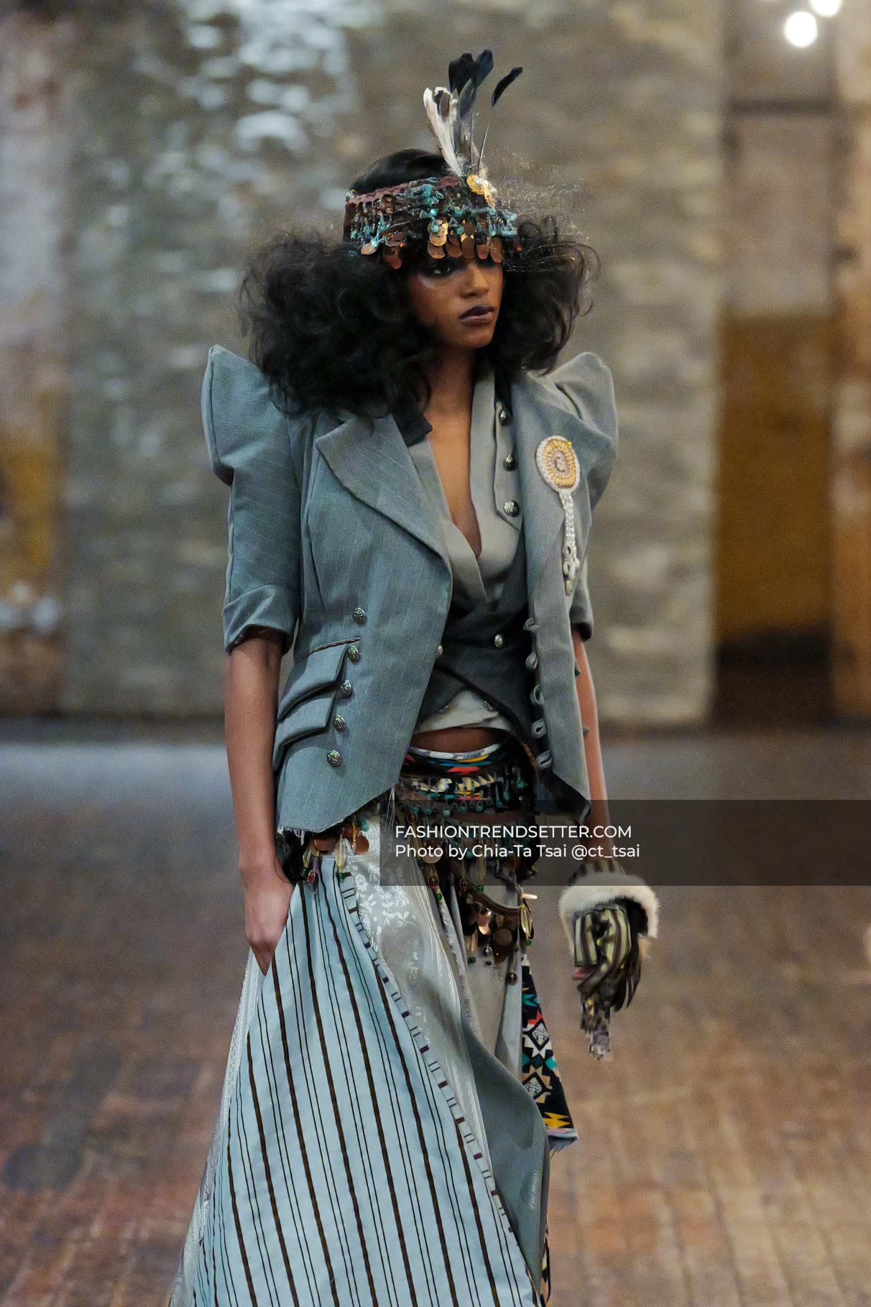 Patterns repeat across the collection-stripes, checks, patchworked surfaces-but they don’t read as decoration. They hold things together. Without them, some of these looks might fall apart under their own weight. With them, they stay just on the edge.