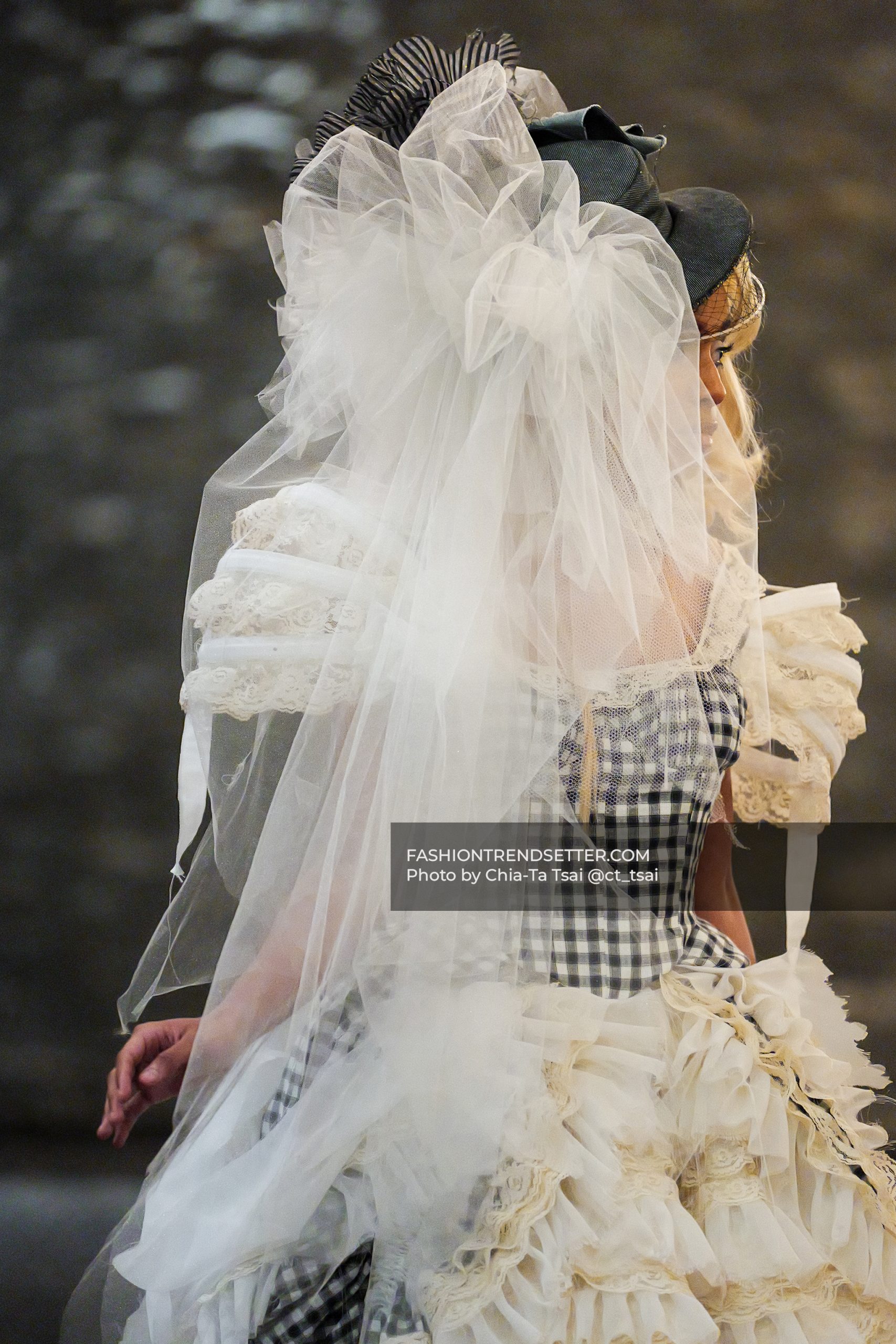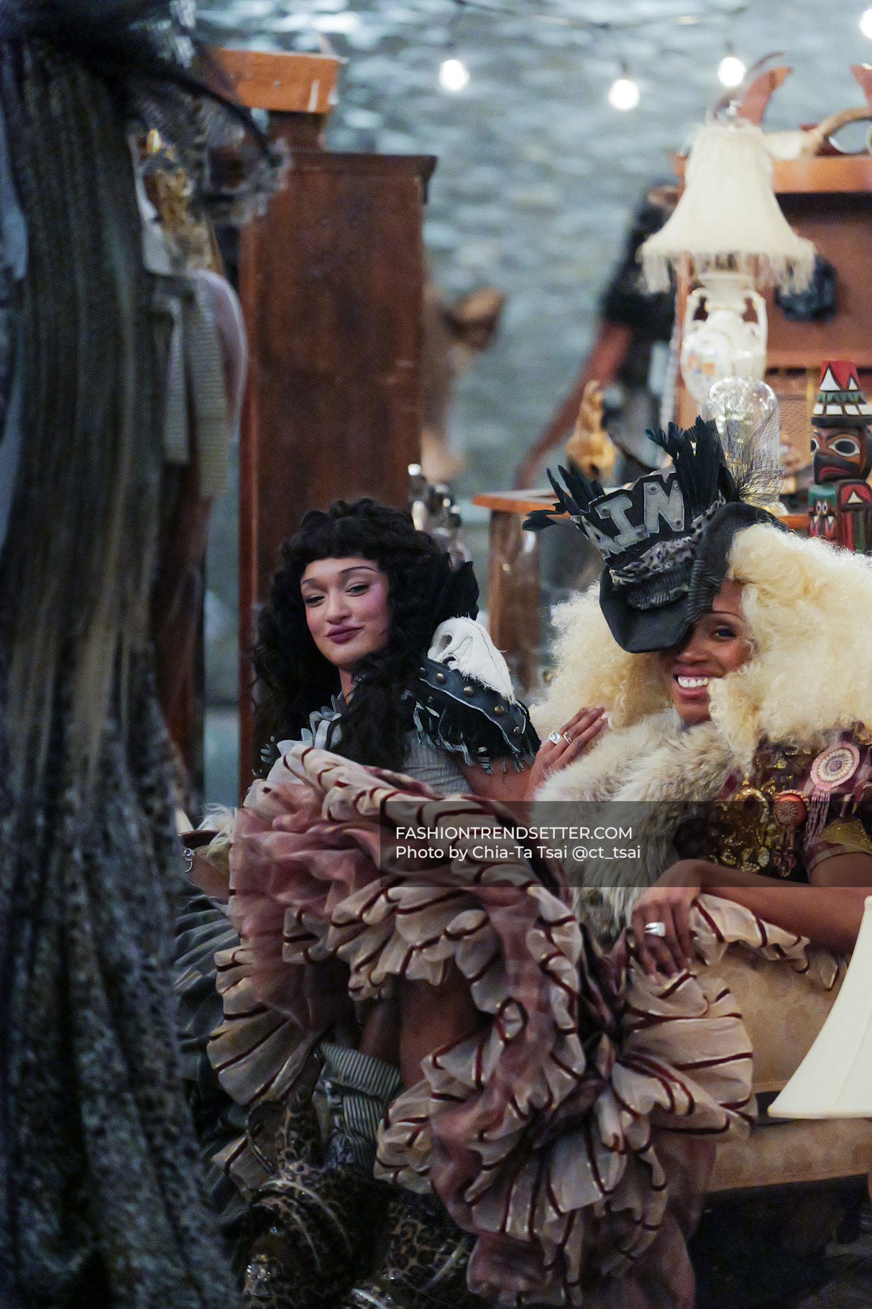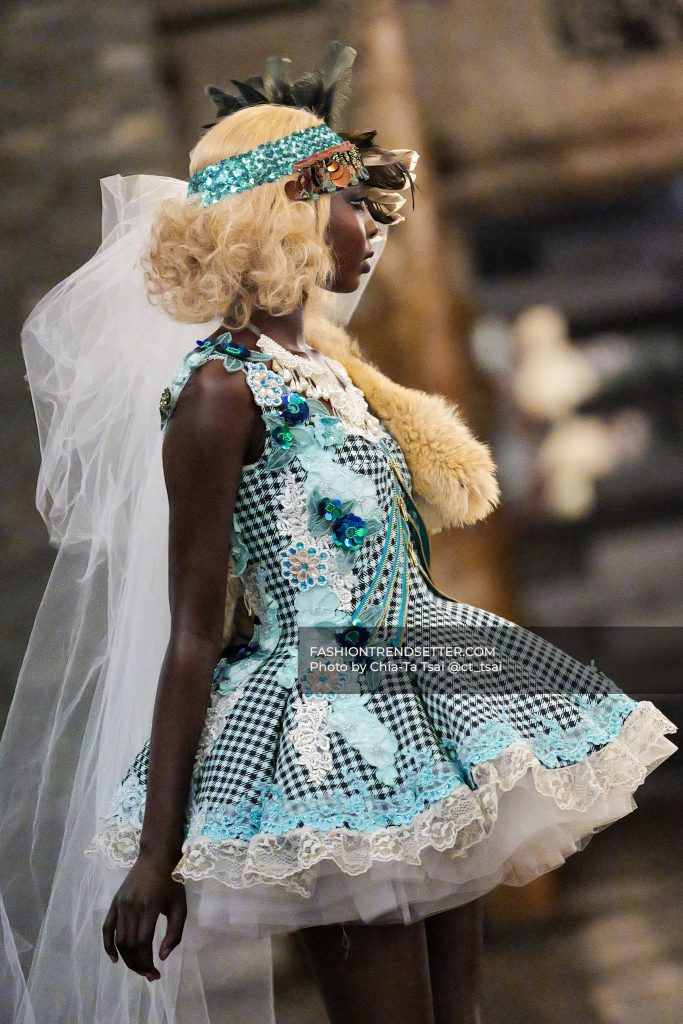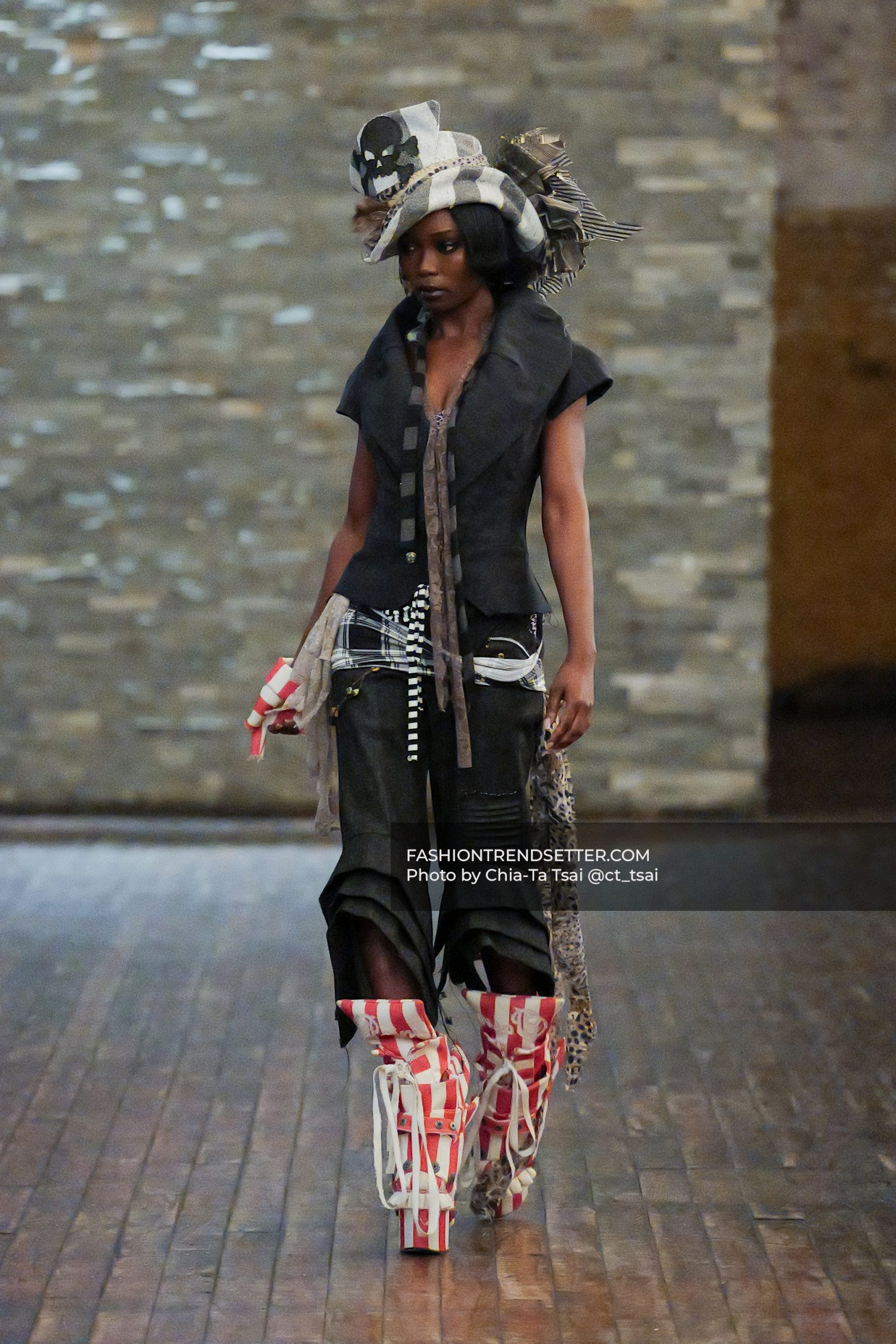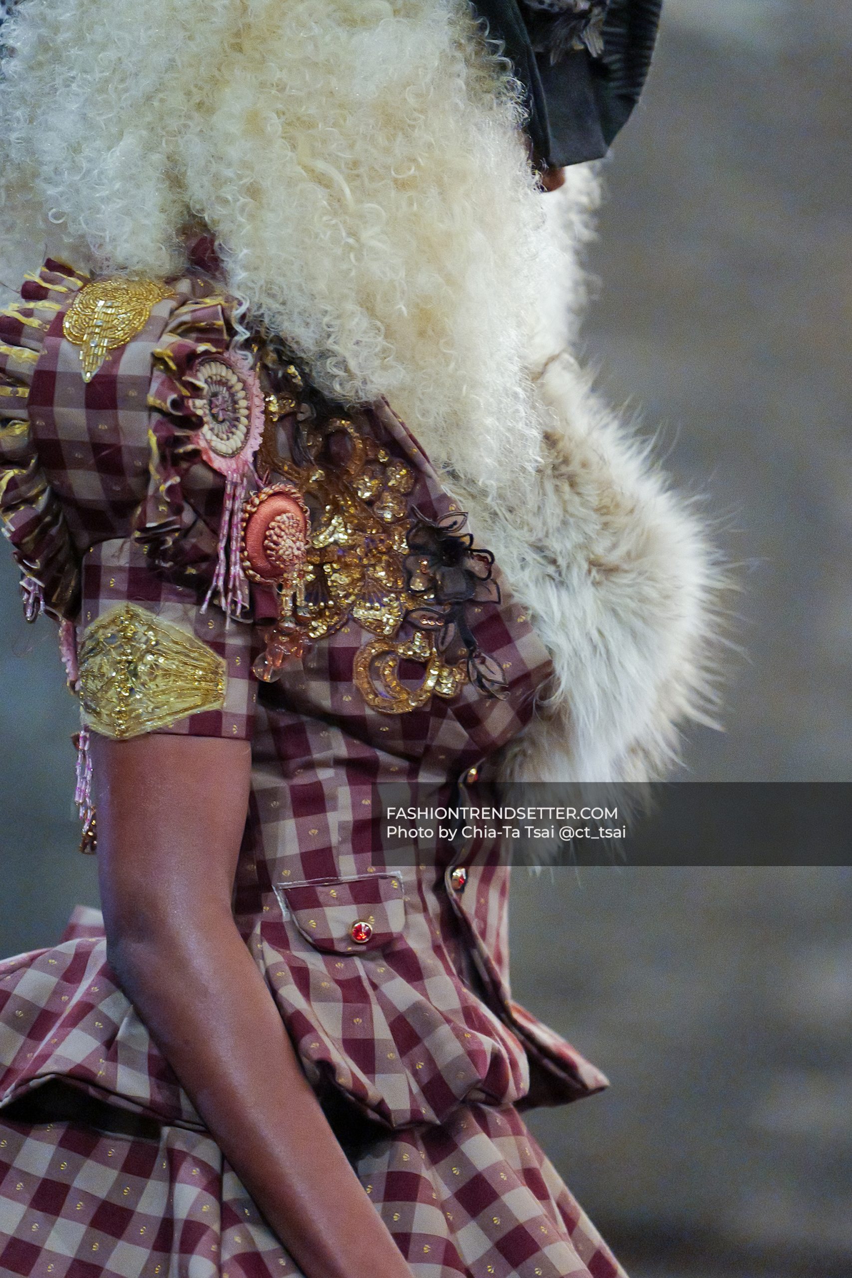Patterns repeat across the collection-stripes, checks, patchworked surfaces-but they don’t read as decoration. They hold things together. Without them, some of these looks might fall apart under their own weight. With them, they stay just on the edge.