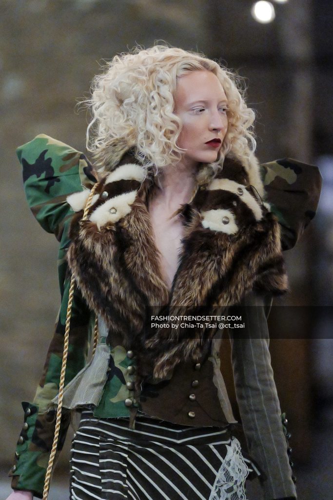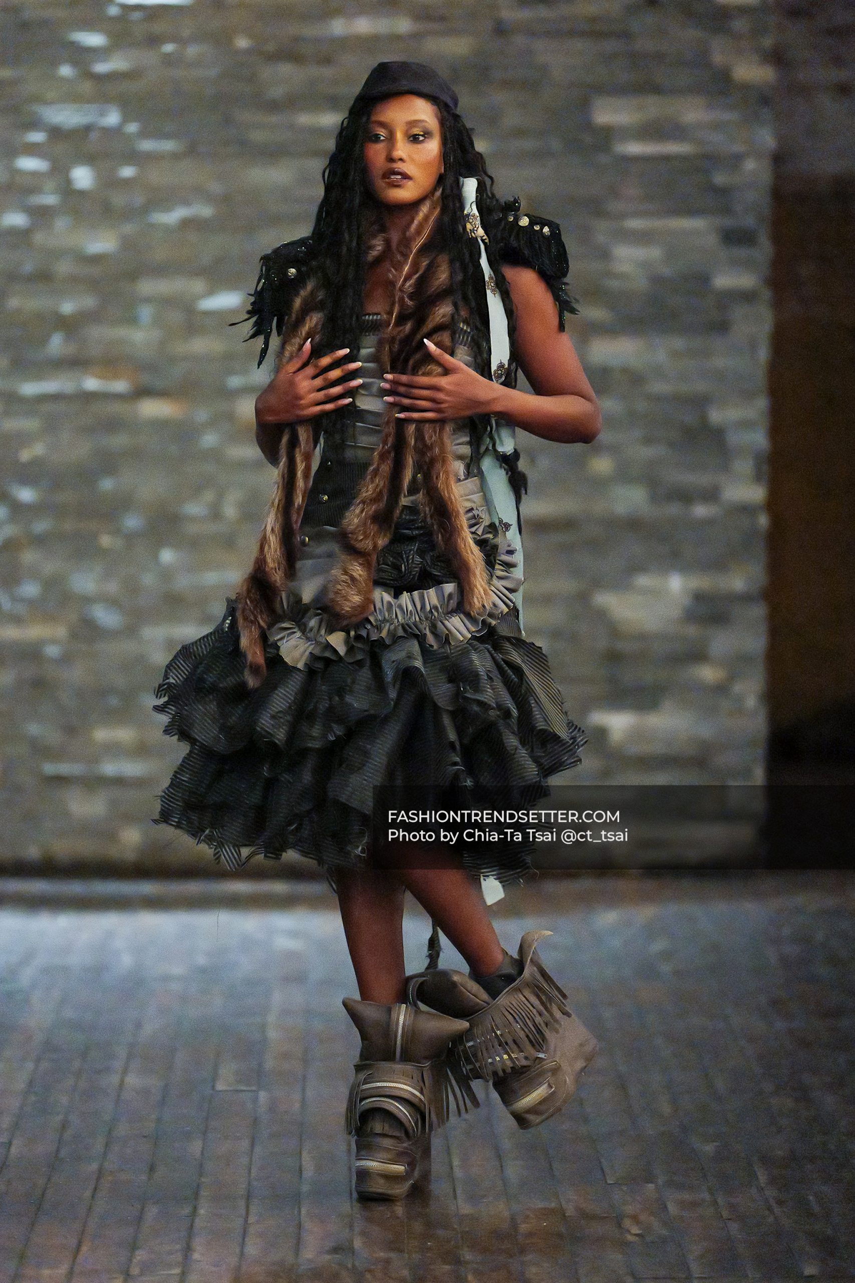 What stands out is how much is happening at once: fur against sheer fabric, dense construction next to something that feels like it could unravel. Embellishments don’t sit quietly, they accumulate, almost instinctively. It never feels overworked, just fully loaded.