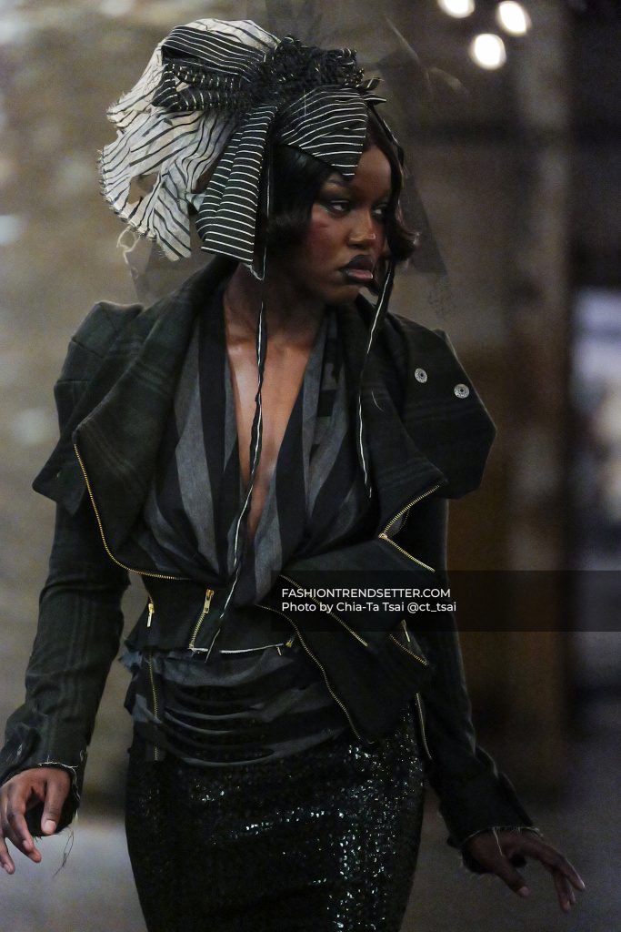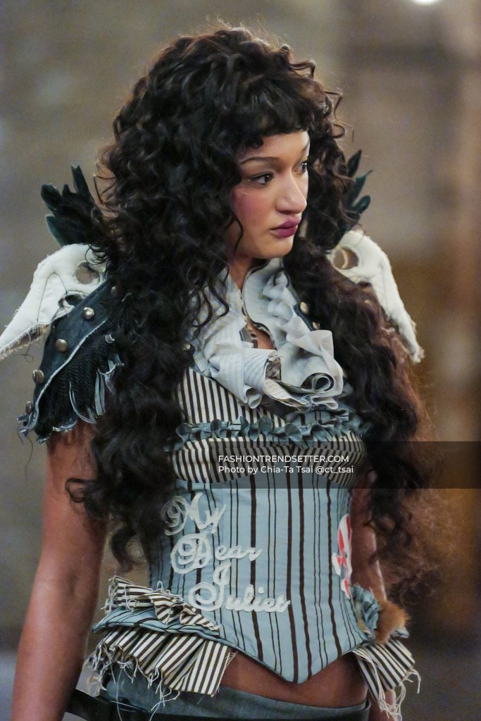 The foundation is structured. Corsetry, sharp tailoring, defined shoulders. You can feel the discipline in the way the body is held. But that structure is constantly pushed off balance. Layers build up, fabrics shift, proportions stretch or collapse slightly. Nothing stays resolved for long.