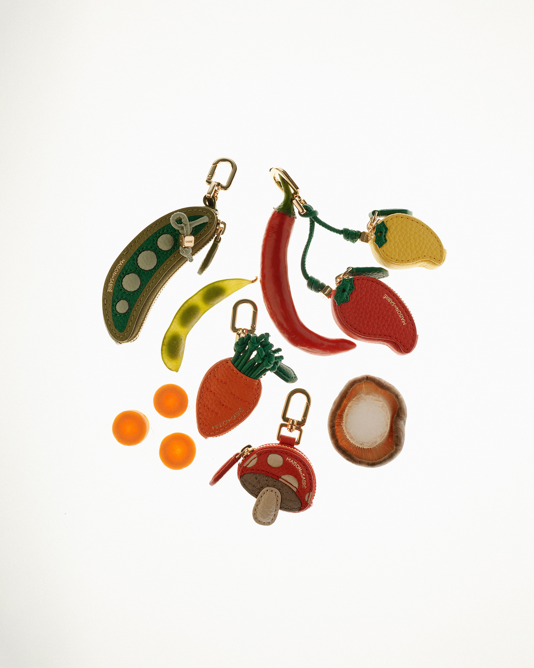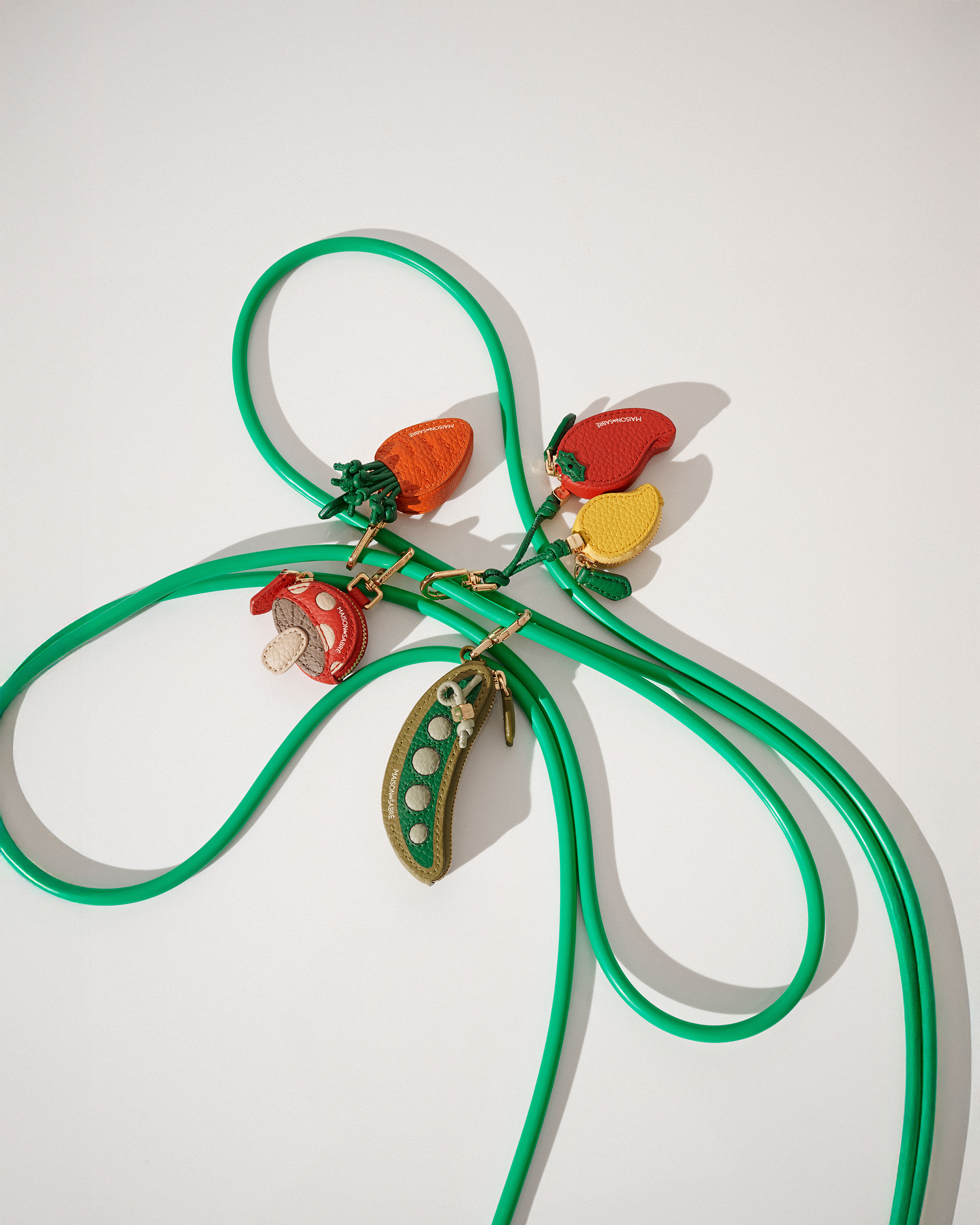 Arriving in four designs – Carrot, Mushroom, Snap Pea and Chilli – each charm is crafted entirely from upcycled leather offcuts generated during the production of MAISON de SABRÉ handbags. The Snap Pea charm introduces a new functional detail for the collection, designed to carry small beauty essentials such as lipstick while remaining discreetly concealed within the leather pod.