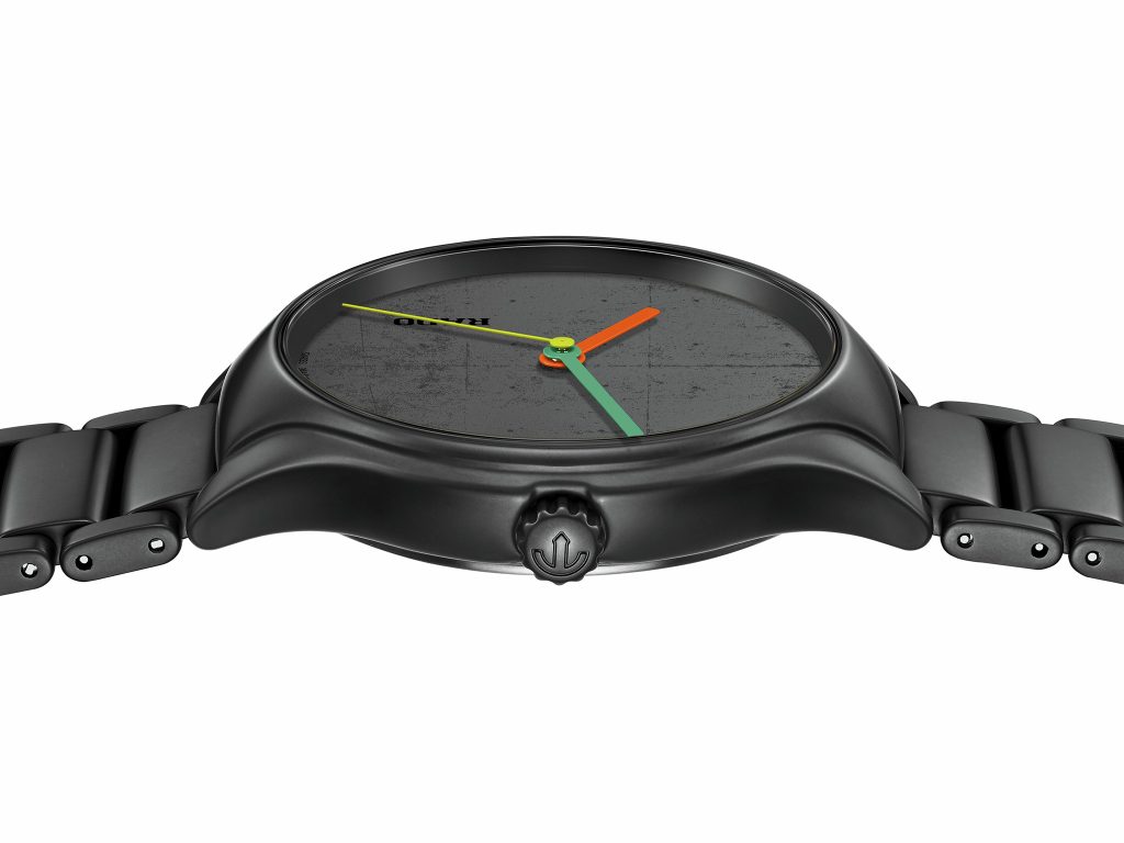 This special edition includes a dial design inspired by detail from the Palace of Assembly, one of three public buildings known as the Capitol Complex, completed in 1962. An abstract inspiration of a section of this monumental building’s facade is laser engraved in the dial, within a darker palette still. Here, the high-tech ceramic monobloc case, crown and bracelet appear in Ivory Black – 4320E from the Polychromie Architectural – accompanied by lacquered hands in Powerful Orange (4320S), Emerald Green (4320G) and Olive Green (4320F).