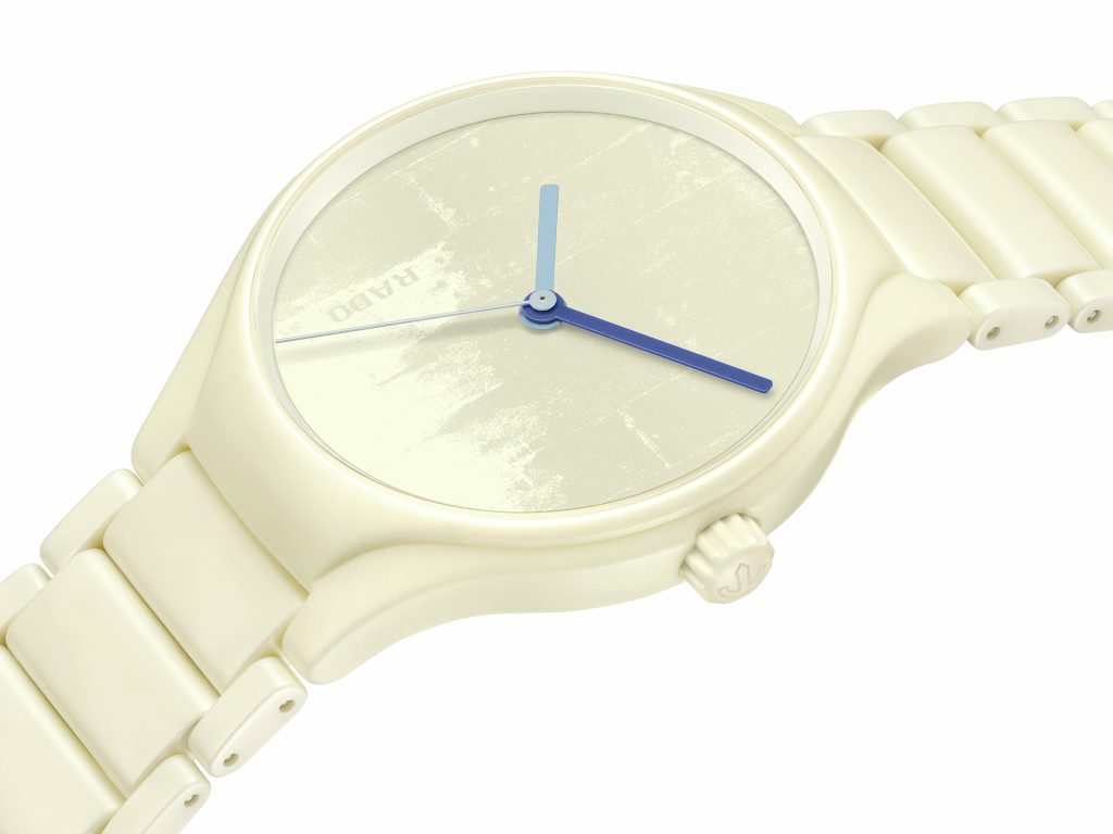This first watch is presented in Ivory White, reference 4320B, across its monobloc high-tech ceramic case and matching crown and bracelet, telling a story of pure, minimalist elegance. It is the first time that this specific color has been deployed in high-tech ceramic. It’s worth remembering that the color runs right through the material – the final hue is not just a coating or finish, but acquired during sintering, when it is heated to 1,450°C. Faithfully recreating an exact shade with this complex methodology is no small thing and took Rado’s experts years to perfect. This timepiece is complemented by hands in Lucent Sky Blue (32021), Luminous Ultramarine Blue (32020) and Light Ultramarine Blue (32023).