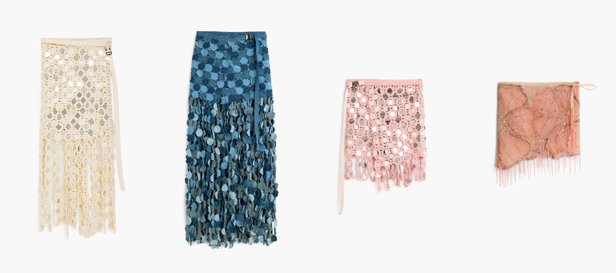 - Textural play: handcrafted crochet pareo skirts with mirror embellishments that capture light and enhance movement.