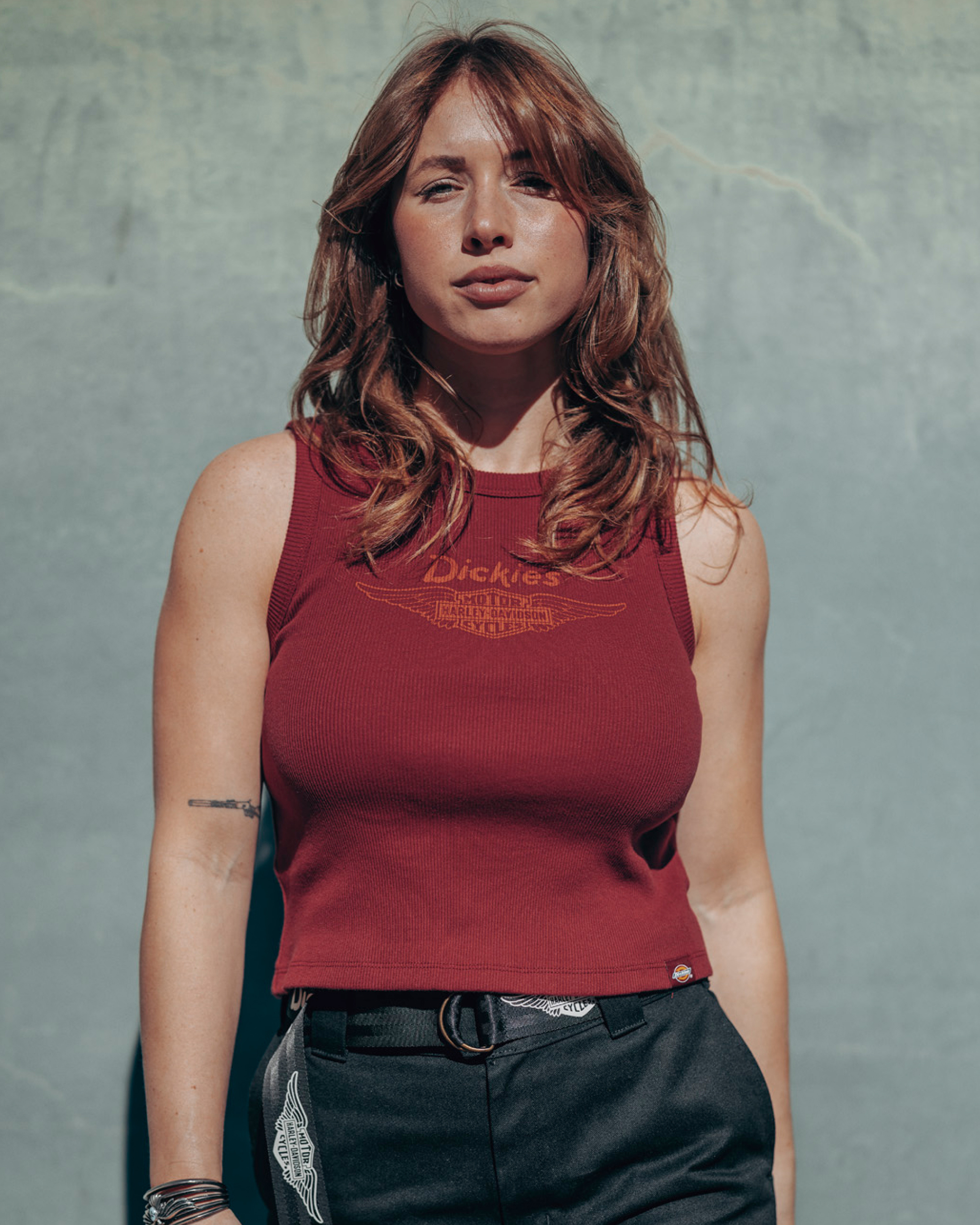 Staying cool is as easy as looking cool in the Dickies® x H-D® Winged Bar & Shield Ribbed Tank. Made from 100% breathable cotton that’s ribbed for a textured look, the slightly cropped silhouette features signature Dickies branding and the Harley-Davidson 1930s Silver Wing logo.